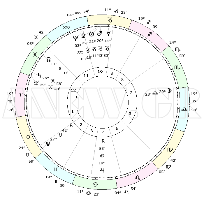 | | ΘΕΣΕΙΣ ΠΛΑΝΗΤΩΝ ΑΣΤΡΟΛΟΓΙΚΟΥ ΧΑΡΤΗ ΤΗΣ ΣΤΙΓΜΗΣ ΑΥΤΗΣ | | | | Πλανήτης | Ζώδιο | Μοίρες | Δεκαήμ. | Σε οίκο | Απόκλιση | | Ακμές των οίκων | | Ηλιος | Αιγόκερως | 20°47' | Τρίτο | 3 | 21 S 50 | | 1ος | 10°56' | Σκορπιός | | Σελήνη | Ζυγός | 24°45' | Τρίτο | 12 | 12 S 55 | | 2ος | 10°05' | Τοξότης | | Ερμής | Αιγόκερως | 14°15' | Δεύτερο | 3 | 24 S 11 | | 3ος | 13°05' | Αιγόκερως | | Αφροδίτη | Αιγόκερως | 21°49' | Τρίτο | 3 | 22 S 31 | | 4ος | 18°03' | Υδροχόος | | Αρης | Αιγόκερως | 20°24' | Τρίτο | 3 | 22 S 49 | | 5ος | 20°41' | Ιχθείς | | Δίας | Καρκίνος | 20°01'R | Τρίτο | 9 | 22 N 12 | | 6ος | 18°13' | Κριός | | Κρόνος | Ιχθείς | 26°57' | Τρίτο | 5 | 03 S 16 | | 7ος | 10°56' | Ταύρος | | Ουρανός | Ταύρος | 27°42'R | Τρίτο | 7 | 19 N 27 | | 8ος | 10°05' | Δίδυμοι | | Ποσειδώνας | Ιχθείς | 29°40' | Τρίτο | 5 | 01 S 21 | | 9ος | 13°05' | Καρκίνος | | Πλούτωνας | Υδροχόος | 03°02' | Πρώτο | 3 | 23 S 09 | | 10ος | 18°03' | Λέων | | Β. Δεσμός | Ιχθείς | 11°38' | Δεύτερο | 4 | 07 S 12 | | 11ος | 20°41' | Παρθένος | | Ωροσκόπος | Σκορπιός | 10°56' | Δεύτερο | | | 12ος | 18°13' | Ζυγός | | Μεσουράνημα | Λέων | 18°03' | Δεύτερο | | | |