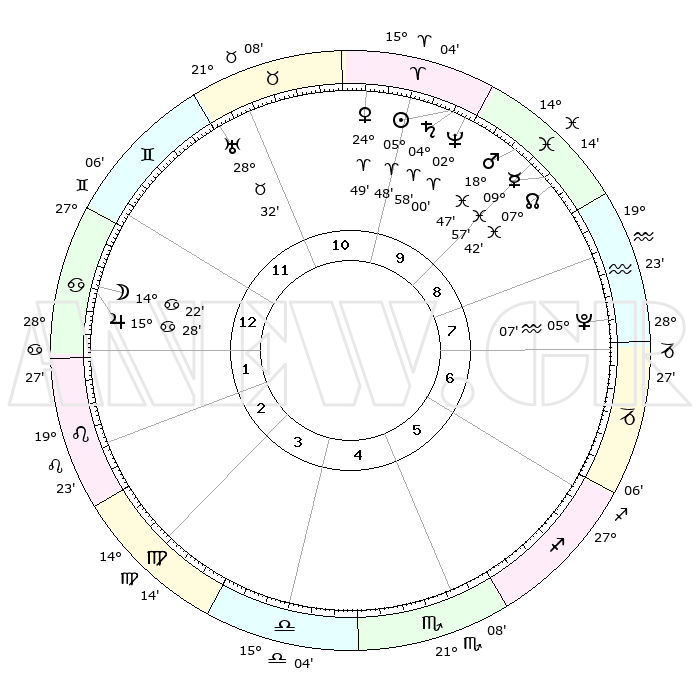| | ΘΕΣΕΙΣ ΠΛΑΝΗΤΩΝ ΑΣΤΡΟΛΟΓΙΚΟΥ ΧΑΡΤΗ ΤΗΣ ΣΤΙΓΜΗΣ ΑΥΤΗΣ | | | | Πλανήτης | Ζώδιο | Μοίρες | Δεκαήμ. | Σε οίκο | Απόκλιση | | Ακμές των οίκων | | Ηλιος | Κριός | 05°44' | Πρώτο | 10 | 02 N 17 | | 1ος | 08°18' | Καρκίνος | | Σελήνη | Καρκίνος | 13°26' | Δεύτερο | 1 | 27 N 02 | | 2ος | 28°46' | Καρκίνος | | Ερμής | Ιχθείς | 09°55' | Πρώτο | 9 | 08 S 07 | | 3ος | 21°14' | Λέων | | Αφροδίτη | Κριός | 24°44' | Τρίτο | 11 | 08 N 58 | | 4ος | 18°55' | Παρθένος | | Αρης | Ιχθείς | 18°44' | Δεύτερο | 9 | 05 S 26 | | 5ος | 24°00' | Ζυγός | | Δίας | Καρκίνος | 15°28' | Δεύτερο | 1 | 22 N 54 | | 6ος | 03°10' | Τοξότης | | Κρόνος | Κριός | 04°58' | Πρώτο | 10 | 00 N 01 | | 7ος | 08°18' | Αιγόκερως | | Ουρανός | Ταύρος | 28°32' | Τρίτο | 11 | 19 N 39 | | 8ος | 28°46' | Αιγόκερως | | Ποσειδώνας | Κριός | 01°60' | Πρώτο | 10 | 00 S 24 | | 9ος | 21°14' | Υδροχόος | | Πλούτωνας | Υδροχόος | 05°07' | Πρώτο | 8 | 22 S 48 | | 10ος | 18°55' | Ιχθείς | | Β. Δεσμός | Ιχθείς | 07°42' | Πρώτο | 9 | 08 S 41 | | 11ος | 24°00' | Κριός | | Ωροσκόπος | Καρκίνος | 08°18' | Πρώτο | | | 12ος | 03°10' | Δίδυμοι | | Μεσουράνημα | Ιχθείς | 18°55' | Δεύτερο | | | |