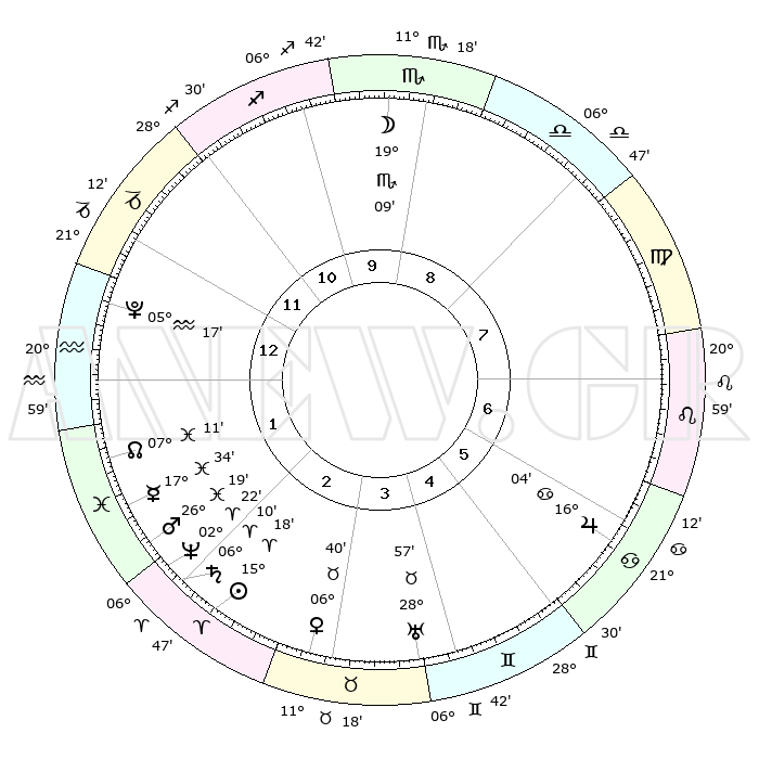 | | ΘΕΣΕΙΣ ΠΛΑΝΗΤΩΝ ΑΣΤΡΟΛΟΓΙΚΟΥ ΧΑΡΤΗ ΤΗΣ ΣΤΙΓΜΗΣ ΑΥΤΗΣ | | | | Πλανήτης | Ζώδιο | Μοίρες | Δεκαήμ. | Σε οίκο | Απόκλιση | | Ακμές των οίκων | | Ηλιος | Κριός | 15°06' | Δεύτερο | 4 | 05 N 57 | | 1ος | 06°28' | Τοξότης | | Σελήνη | Σκορπιός | 16°43' | Δεύτερο | 12 | 21 S 26 | | 2ος | 08°35' | Αιγόκερως | | Ερμής | Ιχθείς | 17°22' | Δεύτερο | 3 | 06 S 41 | | 3ος | 15°23' | Υδροχόος | | Αφροδίτη | Ταύρος | 06°25' | Πρώτο | 5 | 13 N 24 | | 4ος | 21°27' | Ιχθείς | | Αρης | Ιχθείς | 26°09' | Τρίτο | 4 | 02 S 28 | | 5ος | 21°36' | Κριός | | Δίας | Καρκίνος | 16°03' | Δεύτερο | 8 | 22 N 50 | | 6ος | 15°48' | Ταύρος | | Κρόνος | Κριός | 06°09' | Πρώτο | 4 | 00 N 29 | | 7ος | 06°28' | Δίδυμοι | | Ουρανός | Ταύρος | 28°56' | Τρίτο | 6 | 19 N 45 | | 8ος | 08°35' | Καρκίνος | | Ποσειδώνας | Κριός | 02°21' | Πρώτο | 4 | 00 S 16 | | 9ος | 15°23' | Λέων | | Πλούτωνας | Υδροχόος | 05°17' | Πρώτο | 2 | 22 S 47 | | 10ος | 21°27' | Παρθένος | | Β. Δεσμός | Ιχθείς | 07°12' | Πρώτο | 3 | 08 S 52 | | 11ος | 21°36' | Ζυγός | | Ωροσκόπος | Τοξότης | 06°28' | Πρώτο | | | 12ος | 15°48' | Σκορπιός | | Μεσουράνημα | Παρθένος | 21°27' | Τρίτο | | | |