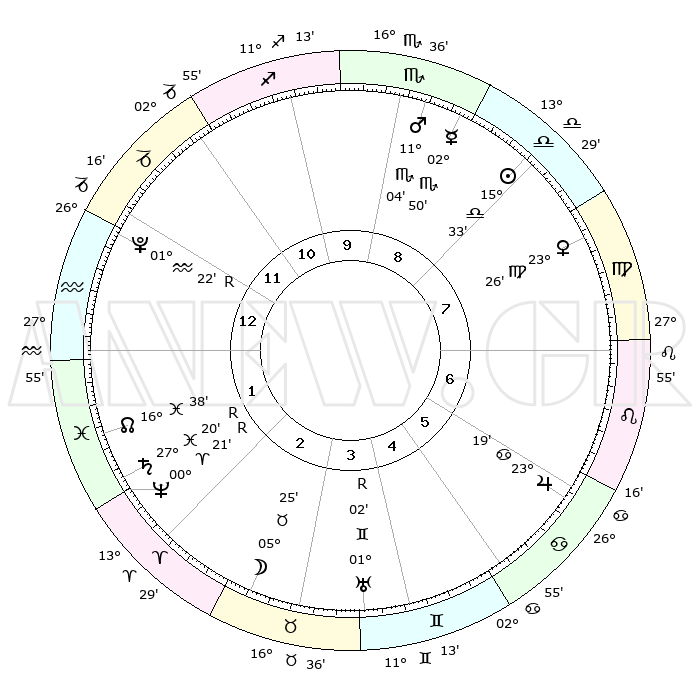 | ΘΕΣΕΙΣ ΠΛΑΝΗΤΩΝ ΑΣΤΡΟΛΟΓΙΚΟΥ ΧΑΡΤΗ ΤΗΣ ΣΤΙΓΜΗΣ ΑΥΤΗΣ | | Πλανήτης | Ζώδιο | Μοίρες | Δεκαήμ. | Σε οίκο | Απόκλιση | | Ακμές των οίκων | Ηλιος | Ζυγός | 15°27' | Δεύτερο | 9 | 06 S 05 | | 1ος | 17°28' | Αιγόκερως | Σελήνη | Ταύρος | 04°04' | Πρώτο | 3 | 16 N 24 | | 2ος | 29°01' | Υδροχόος | Ερμής | Σκορπιός | 02°42' | Πρώτο | 9 | 13 S 20 | | 3ος | 08°58' | Κριός | Αφροδίτη | Παρθένος | 23°19' | Τρίτο | 8 | 03 N 58 | | 4ος | 09°44' | Ταύρος | Αρης | Σκορπιός | 11°00' | Δεύτερο | 10 | 15 S 16 | | 5ος | 03°39' | Δίδυμοι | Δίας | Καρκίνος | 23°19' | Τρίτο | 7 | 21 N 27 | | 6ος | 24°51' | Δίδυμοι | Κρόνος | Ιχθείς | 27°20'R | Τρίτο | 2 | 03 S 22 | | 7ος | 17°28' | Καρκίνος | Ουρανός | Δίδυμοι | 01°02'R | Πρώτο | 4 | 20 N 09 | | 8ος | 29°01' | Λέων | Ποσειδώνας | Κριός | 00°21'R | Πρώτο | 2 | 01 S 07 | | 9ος | 08°58' | Ζυγός | Πλούτωνας | Υδροχόος | 01°22'R | Πρώτο | 1 | 23 S 32 | | 10ος | 09°44' | Σκορπιός | Β. Δεσμός | Ιχθείς | 16°39' | Δεύτερο | 2 | 05 S 16 | | 11ος | 03°39' | Τοξότης | Ωροσκόπος | Αιγόκερως | 17°28' | Δεύτερο | | | 12ος | 24°51' | Τοξότης | Μεσουράνημα | Σκορπιός | 09°44' | Πρώτο | | | |