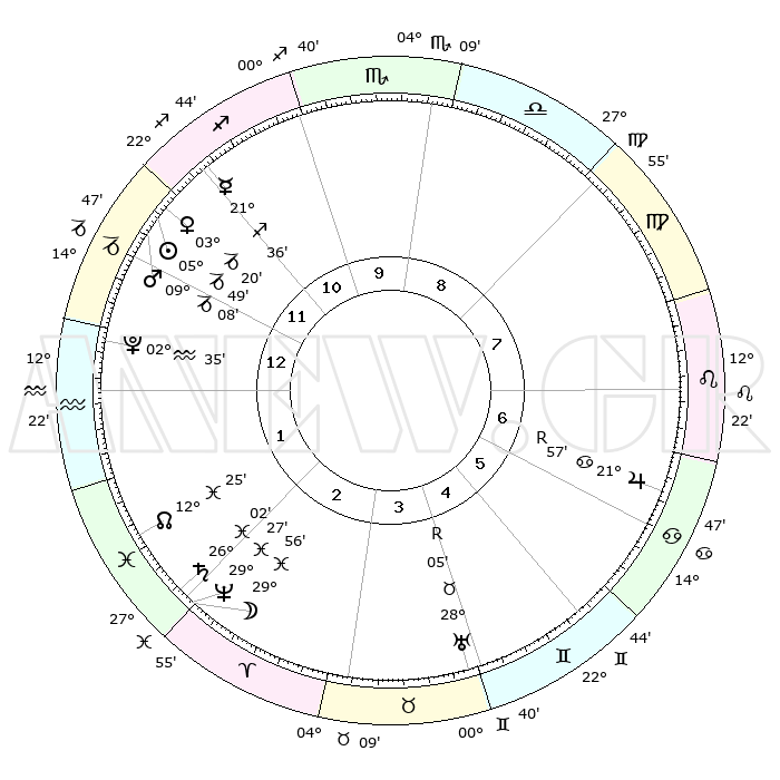 | | ΘΕΣΕΙΣ ΠΛΑΝΗΤΩΝ ΑΣΤΡΟΛΟΓΙΚΟΥ ΧΑΡΤΗ ΤΗΣ ΣΤΙΓΜΗΣ ΑΥΤΗΣ | | | | Πλανήτης | Ζώδιο | Μοίρες | Δεκαήμ. | Σε οίκο | Απόκλιση | | Ακμές των οίκων | | Ηλιος | Αιγόκερως | 05°44' | Πρώτο | 12 | 23 S 18 | | 1ος | 13°12' | Αιγόκερως | | Σελήνη | Ιχθείς | 28°59' | Τρίτο | 2 | 01 N 01 | | 2ος | 23°43' | Υδροχόος | | Ερμής | Τοξότης | 21°30' | Τρίτο | 12 | 23 S 11 | | 3ος | 03°55' | Κριός | | Αφροδίτη | Αιγόκερως | 03°15' | Πρώτο | 12 | 23 S 43 | | 4ος | 05°30' | Ταύρος | | Αρης | Αιγόκερως | 09°04' | Πρώτο | 12 | 23 S 59 | | 5ος | 29°55' | Ταύρος | | Δίας | Καρκίνος | 21°58'R | Τρίτο | 7 | 21 N 52 | | 6ος | 21°11' | Δίδυμοι | | Κρόνος | Ιχθείς | 26°02' | Τρίτο | 2 | 03 S 40 | | 7ος | 13°12' | Καρκίνος | | Ουρανός | Ταύρος | 28°05'R | Τρίτο | 4 | 19 N 32 | | 8ος | 23°43' | Λέων | | Ποσειδώνας | Ιχθείς | 29°27' | Τρίτο | 2 | 01 S 27 | | 9ος | 03°55' | Ζυγός | | Πλούτωνας | Υδροχόος | 02°35' | Πρώτο | 1 | 23 S 15 | | 10ος | 05°30' | Σκορπιός | | Β. Δεσμός | Ιχθείς | 12°25' | Δεύτερο | 2 | 06 S 54 | | 11ος | 29°55' | Σκορπιός | | Ωροσκόπος | Αιγόκερως | 13°12' | Δεύτερο | | | 12ος | 21°11' | Τοξότης | | Μεσουράνημα | Σκορπιός | 05°30' | Πρώτο | | | |