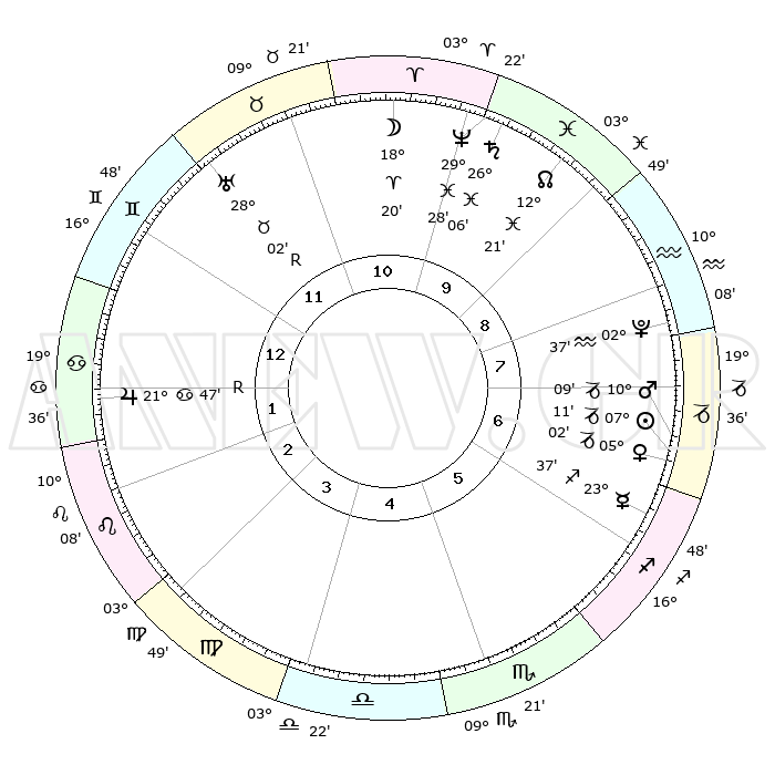 | | ΘΕΣΕΙΣ ΠΛΑΝΗΤΩΝ ΑΣΤΡΟΛΟΓΙΚΟΥ ΧΑΡΤΗ ΤΗΣ ΣΤΙΓΜΗΣ ΑΥΤΗΣ | | | | Πλανήτης | Ζώδιο | Μοίρες | Δεκαήμ. | Σε οίκο | Απόκλιση | | Ακμές των οίκων | | Ηλιος | Αιγόκερως | 07°07' | Πρώτο | 7 | 23 S 15 | | 1ος | 28°38' | Δίδυμοι | | Σελήνη | Κριός | 17°24' | Δεύτερο | 11 | 09 N 36 | | 2ος | 19°30' | Καρκίνος | | Ερμής | Τοξότης | 23°31' | Τρίτο | 6 | 23 S 27 | | 3ος | 11°13' | Λέων | | Αφροδίτη | Αιγόκερως | 04°57' | Πρώτο | 7 | 23 S 43 | | 4ος | 07°19' | Παρθένος | | Αρης | Αιγόκερως | 10°06' | Δεύτερο | 7 | 23 S 55 | | 5ος | 11°02' | Ζυγός | | Δίας | Καρκίνος | 21°47'R | Τρίτο | 2 | 21 N 54 | | 6ος | 21°08' | Σκορπιός | | Κρόνος | Ιχθείς | 26°06' | Τρίτο | 10 | 03 S 38 | | 7ος | 28°38' | Τοξότης | | Ουρανός | Ταύρος | 28°02'R | Τρίτο | 12 | 19 N 31 | | 8ος | 19°30' | Αιγόκερως | | Ποσειδώνας | Ιχθείς | 29°28' | Τρίτο | 10 | 01 S 26 | | 9ος | 11°13' | Υδροχόος | | Πλούτωνας | Υδροχόος | 02°37' | Πρώτο | 8 | 23 S 14 | | 10ος | 07°19' | Ιχθείς | | Β. Δεσμός | Ιχθείς | 12°21' | Δεύτερο | 10 | 06 S 56 | | 11ος | 11°02' | Κριός | | Ωροσκόπος | Δίδυμοι | 28°38' | Τρίτο | | | 12ος | 21°08' | Ταύρος | | Μεσουράνημα | Ιχθείς | 07°19' | Πρώτο | | | |
