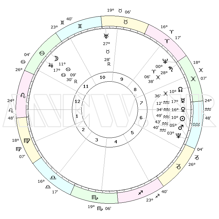 | | ΘΕΣΕΙΣ ΠΛΑΝΗΤΩΝ ΑΣΤΡΟΛΟΓΙΚΟΥ ΧΑΡΤΗ ΤΗΣ ΣΤΙΓΜΗΣ ΑΥΤΗΣ | | | | Πλανήτης | Ζώδιο | Μοίρες | Δεκαήμ. | Σε οίκο | Απόκλιση | | Ακμές των οίκων | | Ηλιος | Υδροχόος | 10°45' | Δεύτερο | 7 | 17 S 32 | | 1ος | 09°07' | Λέων | | Σελήνη | Καρκίνος | 10°22' | Δεύτερο | 12 | 27 N 29 | | 2ος | 00°52' | Παρθένος | | Ερμής | Υδροχόος | 17°06' | Δεύτερο | 7 | 17 S 34 | | 3ος | 27°09' | Παρθένος | | Αφροδίτη | Υδροχόος | 16°30' | Δεύτερο | 7 | 17 S 10 | | 4ος | 29°09' | Ζυγός | | Αρης | Υδροχόος | 05°41' | Πρώτο | 6 | 19 S 51 | | 5ος | 04°48' | Τοξότης | | Δίας | Καρκίνος | 17°30'R | Δεύτερο | 12 | 22 N 35 | | 6ος | 09°05' | Αιγόκερως | | Κρόνος | Ιχθείς | 28°38' | Τρίτο | 9 | 02 S 33 | | 7ος | 09°07' | Υδροχόος | | Ουρανός | Ταύρος | 27°28'R | Τρίτο | 10 | 19 N 24 | | 8ος | 00°52' | Ιχθείς | | Ποσειδώνας | Κριός | 00°06' | Πρώτο | 9 | 01 S 10 | | 9ος | 27°09' | Ιχθείς | | Πλούτωνας | Υδροχόος | 03°39' | Πρώτο | 6 | 23 S 02 | | 10ος | 29°09' | Κριός | | Β. Δεσμός | Ιχθείς | 10°36' | Δεύτερο | 8 | 07 S 35 | | 11ος | 04°48' | Δίδυμοι | | Ωροσκόπος | Λέων | 09°07' | Πρώτο | | | 12ος | 09°05' | Καρκίνος | | Μεσουράνημα | Κριός | 29°09' | Τρίτο | | | |
