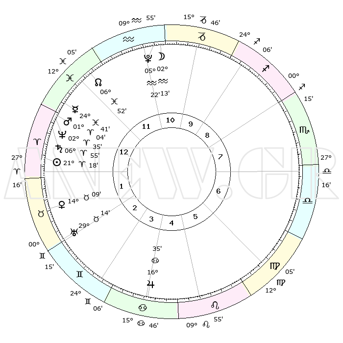 | | ΘΕΣΕΙΣ ΠΛΑΝΗΤΩΝ ΑΣΤΡΟΛΟΓΙΚΟΥ ΧΑΡΤΗ ΤΗΣ ΣΤΙΓΜΗΣ ΑΥΤΗΣ | | | | Πλανήτης | Ζώδιο | Μοίρες | Δεκαήμ. | Σε οίκο | Απόκλιση | | Ακμές των οίκων | | Ηλιος | Κριός | 21°14' | Τρίτο | 1 | 08 N 17 | | 1ος | 11°52' | Ιχθείς | | Σελήνη | Υδροχόος | 01°15' | Πρώτο | 11 | 22 S 54 | | 2ος | 25°52' | Κριός | | Ερμής | Ιχθείς | 24°35' | Τρίτο | 1 | 04 S 22 | | 3ος | 26°19' | Ταύρος | | Αφροδίτη | Ταύρος | 14°03' | Δεύτερο | 2 | 16 N 03 | | 4ος | 19°41' | Δίδυμοι | | Αρης | Κριός | 01°00' | Πρώτο | 1 | 00 S 31 | | 5ος | 11°27' | Καρκίνος | | Δίας | Καρκίνος | 16°35' | Δεύτερο | 5 | 22 N 47 | | 6ος | 06°21' | Λέων | | Κρόνος | Κριός | 06°55' | Πρώτο | 1 | 00 N 47 | | 7ος | 11°52' | Παρθένος | | Ουρανός | Ταύρος | 29°14' | Τρίτο | 3 | 19 N 49 | | 8ος | 25°52' | Ζυγός | | Ποσειδώνας | Κριός | 02°35' | Πρώτο | 1 | 00 S 11 | | 9ος | 26°19' | Σκορπιός | | Πλούτωνας | Υδροχόος | 05°21' | Πρώτο | 11 | 22 S 47 | | 10ος | 19°41' | Τοξότης | | Β. Δεσμός | Ιχθείς | 06°52' | Πρώτο | 12 | 08 S 59 | | 11ος | 11°27' | Αιγόκερως | | Ωροσκόπος | Ιχθείς | 11°52' | Δεύτερο | | | 12ος | 06°21' | Υδροχόος | | Μεσουράνημα | Τοξότης | 19°41' | Δεύτερο | | | |
