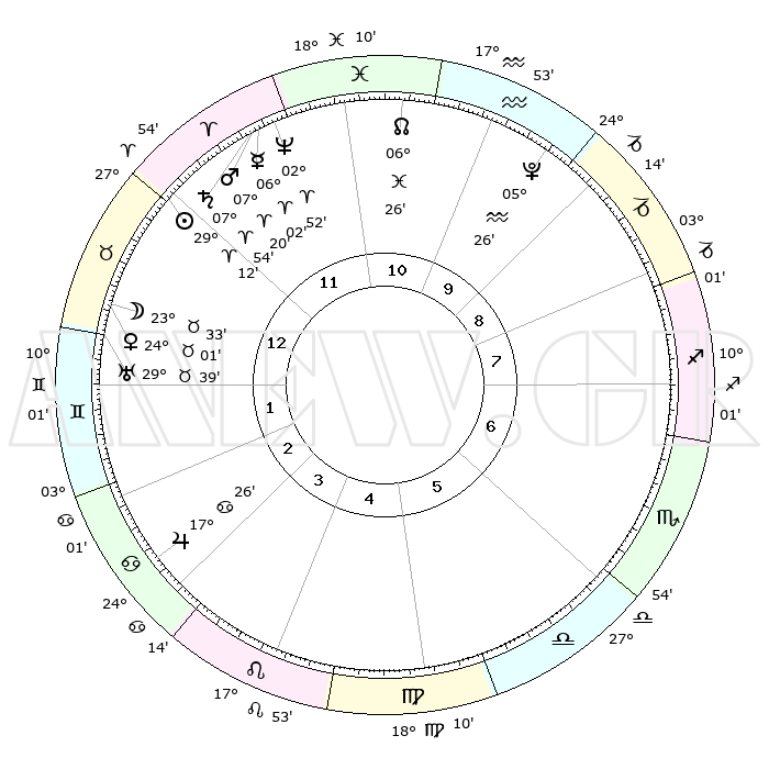 | | ΘΕΣΕΙΣ ΠΛΑΝΗΤΩΝ ΑΣΤΡΟΛΟΓΙΚΟΥ ΧΑΡΤΗ ΤΗΣ ΣΤΙΓΜΗΣ ΑΥΤΗΣ | | | | Πλανήτης | Ζώδιο | Μοίρες | Δεκαήμ. | Σε οίκο | Απόκλιση | | Ακμές των οίκων | | Ηλιος | Κριός | 29°09' | Τρίτο | 12 | 11 N 10 | | 1ος | 16°21' | Ταύρος | | Σελήνη | Ταύρος | 22°44' | Τρίτο | 1 | 23 N 13 | | 2ος | 14°15' | Δίδυμοι | | Ερμής | Κριός | 05°57' | Πρώτο | 12 | 00 S 03 | | 3ος | 06°23' | Καρκίνος | | Αφροδίτη | Ταύρος | 23°57' | Τρίτο | 1 | 19 N 06 | | 4ος | 28°24' | Καρκίνος | | Αρης | Κριός | 07°17' | Πρώτο | 12 | 02 N 01 | | 5ος | 24°44' | Λέων | | Δίας | Καρκίνος | 17°25' | Δεύτερο | 3 | 22 N 41 | | 6ος | 00°43' | Ζυγός | | Κρόνος | Κριός | 07°53' | Πρώτο | 12 | 01 N 09 | | 7ος | 16°21' | Σκορπιός | | Ουρανός | Ταύρος | 29°38' | Τρίτο | 1 | 19 N 54 | | 8ος | 14°15' | Τοξότης | | Ποσειδώνας | Κριός | 02°52' | Πρώτο | 12 | 00 S 04 | | 9ος | 06°23' | Αιγόκερως | | Πλούτωνας | Υδροχόος | 05°26' | Πρώτο | 10 | 22 S 47 | | 10ος | 28°24' | Αιγόκερως | | Β. Δεσμός | Ιχθείς | 06°26' | Πρώτο | 11 | 09 S 09 | | 11ος | 24°44' | Υδροχόος | | Ωροσκόπος | Ταύρος | 16°21' | Δεύτερο | | | 12ος | 00°43' | Κριός | | Μεσουράνημα | Αιγόκερως | 28°24' | Τρίτο | | | |