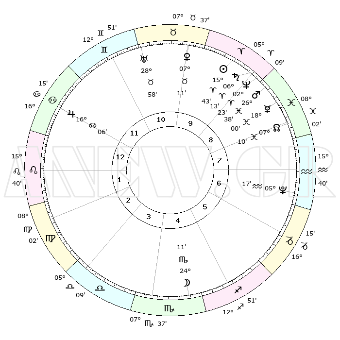 | | ΘΕΣΕΙΣ ΠΛΑΝΗΤΩΝ ΑΣΤΡΟΛΟΓΙΚΟΥ ΧΑΡΤΗ ΤΗΣ ΣΤΙΓΜΗΣ ΑΥΤΗΣ | | | | Πλανήτης | Ζώδιο | Μοίρες | Δεκαήμ. | Σε οίκο | Απόκλιση | | Ακμές των οίκων | | Ηλιος | Κριός | 15°25' | Δεύτερο | 12 | 06 N 04 | | 1ος | 23°12' | Κριός | | Σελήνη | Σκορπιός | 20°29' | Τρίτο | 7 | 22 S 36 | | 2ος | 27°19' | Ταύρος | | Ερμής | Ιχθείς | 17°41' | Δεύτερο | 12 | 06 S 36 | | 3ος | 21°37' | Δίδυμοι | | Αφροδίτη | Ταύρος | 06°48' | Πρώτο | 1 | 13 N 32 | | 4ος | 13°18' | Καρκίνος | | Αρης | Ιχθείς | 26°24' | Τρίτο | 12 | 02 S 23 | | 5ος | 07°05' | Λέων | | Δίας | Καρκίνος | 16°05' | Δεύτερο | 4 | 22 N 50 | | 6ος | 08°29' | Παρθένος | | Κρόνος | Κριός | 06°11' | Πρώτο | 12 | 00 N 30 | | 7ος | 23°12' | Ζυγός | | Ουρανός | Ταύρος | 28°57' | Τρίτο | 2 | 19 N 45 | | 8ος | 27°19' | Σκορπιός | | Ποσειδώνας | Κριός | 02°22' | Πρώτο | 12 | 00 S 16 | | 9ος | 21°37' | Τοξότης | | Πλούτωνας | Υδροχόος | 05°17' | Πρώτο | 10 | 22 S 47 | | 10ος | 13°18' | Αιγόκερως | | Β. Δεσμός | Ιχθείς | 07°11' | Πρώτο | 11 | 08 S 52 | | 11ος | 07°05' | Υδροχόος | | Ωροσκόπος | Κριός | 23°12' | Τρίτο | | | 12ος | 08°29' | Ιχθείς | | Μεσουράνημα | Αιγόκερως | 13°18' | Δεύτερο | | | |