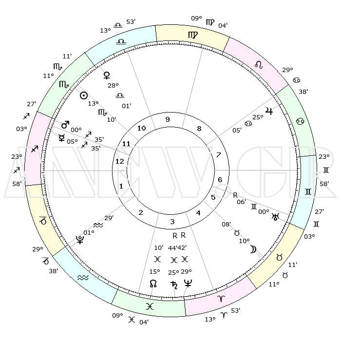 | | ΘΕΣΕΙΣ ΠΛΑΝΗΤΩΝ ΑΣΤΡΟΛΟΓΙΚΟΥ ΧΑΡΤΗ ΤΗΣ ΣΤΙΓΜΗΣ ΑΥΤΗΣ | | | | Πλανήτης | Ζώδιο | Μοίρες | Δεκαήμ. | Σε οίκο | Απόκλιση | | Ακμές των οίκων | | Ηλιος | Σκορπιός | 13°02' | Δεύτερο | 12 | 15 S 45 | | 1ος | 15°16' | Σκορπιός | | Σελήνη | Ταύρος | 08°09' | Πρώτο | 6 | 17 N 59 | | 2ος | 14°46' | Τοξότης | | Ερμής | Τοξότης | 05°30' | Πρώτο | 1 | 23 S 59 | | 3ος | 18°17' | Αιγόκερως | | Αφροδίτη | Ζυγός | 27°51' | Τρίτο | 12 | 09 S 23 | | 4ος | 23°35' | Υδροχόος | | Αρης | Τοξότης | 00°30' | Πρώτο | 1 | 20 S 40 | | 5ος | 25°59' | Ιχθείς | | Δίας | Καρκίνος | 25°05' | Τρίτο | 9 | 21 N 12 | | 6ος | 22°59' | Κριός | | Κρόνος | Ιχθείς | 25°45'R | Τρίτο | 4 | 03 S 57 | | 7ος | 15°16' | Ταύρος | | Ουρανός | Δίδυμοι | 00°07'R | Πρώτο | 7 | 19 N 58 | | 8ος | 14°46' | Δίδυμοι | | Ποσειδώνας | Ιχθείς | 29°42'R | Τρίτο | 5 | 01 S 22 | | 9ος | 18°17' | Καρκίνος | | Πλούτωνας | Υδροχόος | 01°29' | Πρώτο | 3 | 23 S 30 | | 10ος | 23°35' | Λέων | | Β. Δεσμός | Ιχθείς | 15°11' | Δεύτερο | 4 | 05 S 50 | | 11ος | 25°59' | Παρθένος | | Ωροσκόπος | Σκορπιός | 15°16' | Δεύτερο | | | 12ος | 22°59' | Ζυγός | | Μεσουράνημα | Λέων | 23°35' | Τρίτο | | | |