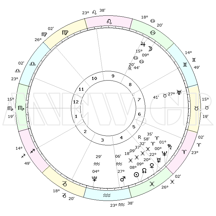 | | ΘΕΣΕΙΣ ΠΛΑΝΗΤΩΝ ΑΣΤΡΟΛΟΓΙΚΟΥ ΧΑΡΤΗ ΤΗΣ ΣΤΙΓΜΗΣ ΑΥΤΗΣ | | | | Πλανήτης | Ζώδιο | Μοίρες | Δεκαήμ. | Σε οίκο | Απόκλιση | | Ακμές των οίκων | | Ηλιος | Ιχθείς | 08°15' | Πρώτο | 5 | 08 S 29 | | 1ος | 27°59' | Ζυγός | | Σελήνη | Καρκίνος | 08°54' | Πρώτο | 9 | 27 N 42 | | 2ος | 26°17' | Σκορπιός | | Ερμής | Ιχθείς | 22°32'R | Τρίτο | 5 | 00 S 17 | | 3ος | 28°05' | Τοξότης | | Αφροδίτη | Ιχθείς | 20°32' | Τρίτο | 5 | 05 S 02 | | 4ος | 02°08' | Υδροχόος | | Αρης | Υδροχόος | 27°03' | Τρίτο | 4 | 13 S 31 | | 5ος | 05°04' | Ιχθείς | | Δίας | Καρκίνος | 15°20'R | Δεύτερο | 9 | 22 N 54 | | 6ος | 03°55' | Κριός | | Κρόνος | Κριός | 01°35' | Πρώτο | 5 | 01 S 20 | | 7ος | 27°59' | Κριός | | Ουρανός | Ταύρος | 27°41' | Τρίτο | 8 | 19 N 28 | | 8ος | 26°17' | Ταύρος | | Ποσειδώνας | Κριός | 00°58' | Πρώτο | 5 | 00 S 49 | | 9ος | 28°05' | Δίδυμοι | | Πλούτωνας | Υδροχόος | 04°29' | Πρώτο | 4 | 22 S 53 | | 10ος | 02°08' | Λέων | | Β. Δεσμός | Ιχθείς | 09°10' | Πρώτο | 5 | 08 S 08 | | 11ος | 05°04' | Παρθένος | | Ωροσκόπος | Ζυγός | 27°59' | Τρίτο | | | 12ος | 03°55' | Ζυγός | | Μεσουράνημα | Λέων | 02°08' | Πρώτο | | | |