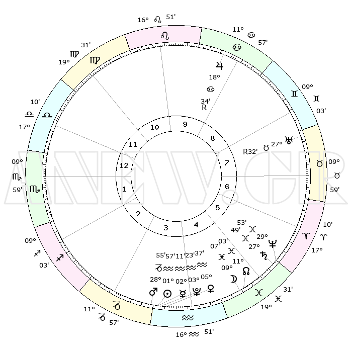 | | ΘΕΣΕΙΣ ΠΛΑΝΗΤΩΝ ΑΣΤΡΟΛΟΓΙΚΟΥ ΧΑΡΤΗ ΤΗΣ ΣΤΙΓΜΗΣ ΑΥΤΗΣ | | | | Πλανήτης | Ζώδιο | Μοίρες | Δεκαήμ. | Σε οίκο | Απόκλιση | | Ακμές των οίκων | | Ηλιος | Υδροχόος | 01°52' | Πρώτο | 4 | 19 S 44 | | 1ος | 17°43' | Ζυγός | | Σελήνη | Ιχθείς | 08°07' | Πρώτο | 5 | 08 S 38 | | 2ος | 15°26' | Σκορπιός | | Ερμής | Υδροχόος | 02°03' | Πρώτο | 4 | 21 S 42 | | 3ος | 16°36' | Τοξότης | | Αφροδίτη | Υδροχόος | 05°31' | Πρώτο | 4 | 20 S 01 | | 4ος | 20°05' | Αιγόκερως | | Αρης | Αιγόκερως | 28°51' | Τρίτο | 4 | 21 S 22 | | 5ος | 23°02' | Υδροχόος | | Δίας | Καρκίνος | 18°34'R | Δεύτερο | 9 | 22 N 26 | | 6ος | 22°38' | Ιχθείς | | Κρόνος | Ιχθείς | 27°49' | Τρίτο | 6 | 02 S 53 | | 7ος | 17°43' | Κριός | | Ουρανός | Ταύρος | 27°32'R | Τρίτο | 8 | 19 N 25 | | 8ος | 15°26' | Ταύρος | | Ποσειδώνας | Ιχθείς | 29°53' | Τρίτο | 6 | 01 S 15 | | 9ος | 16°36' | Δίδυμοι | | Πλούτωνας | Υδροχόος | 03°23' | Πρώτο | 4 | 23 S 05 | | 10ος | 20°05' | Καρκίνος | | Β. Δεσμός | Ιχθείς | 11°04' | Δεύτερο | 5 | 07 S 25 | | 11ος | 23°02' | Λέων | | Ωροσκόπος | Ζυγός | 17°43' | Δεύτερο | | | 12ος | 22°38' | Παρθένος | | Μεσουράνημα | Καρκίνος | 20°05' | Τρίτο | | | |