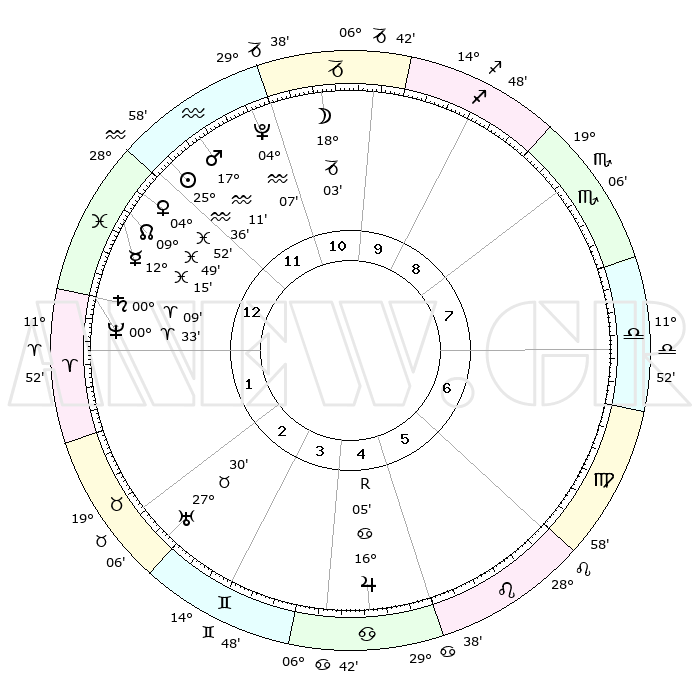 | | ΘΕΣΕΙΣ ΠΛΑΝΗΤΩΝ ΑΣΤΡΟΛΟΓΙΚΟΥ ΧΑΡΤΗ ΤΗΣ ΣΤΙΓΜΗΣ ΑΥΤΗΣ | | | | Πλανήτης | Ζώδιο | Μοίρες | Δεκαήμ. | Σε οίκο | Απόκλιση | | Ακμές των οίκων | | Ηλιος | Υδροχόος | 25°31' | Τρίτο | 1 | 13 S 01 | | 1ος | 24°20' | Υδροχόος | | Σελήνη | Αιγόκερως | 17°02' | Δεύτερο | 11 | 26 S 28 | | 2ος | 10°04' | Κριός | | Ερμής | Ιχθείς | 12°07' | Δεύτερο | 1 | 07 S 07 | | 3ος | 13°55' | Ταύρος | | Αφροδίτη | Ιχθείς | 04°46' | Πρώτο | 1 | 11 S 08 | | 4ος | 08°55' | Δίδυμοι | | Αρης | Υδροχόος | 17°07' | Δεύτερο | 12 | 16 S 44 | | 5ος | 00°39' | Καρκίνος | | Δίας | Καρκίνος | 16°05'R | Δεύτερο | 5 | 22 N 47 | | 6ος | 23°40' | Καρκίνος | | Κρόνος | Κριός | 00°08' | Πρώτο | 1 | 01 S 55 | | 7ος | 24°20' | Λέων | | Ουρανός | Ταύρος | 27°30' | Τρίτο | 3 | 19 N 25 | | 8ος | 10°04' | Ζυγός | | Ποσειδώνας | Κριός | 00°33' | Πρώτο | 1 | 00 S 59 | | 9ος | 13°55' | Σκορπιός | | Πλούτωνας | Υδροχόος | 04°07' | Πρώτο | 12 | 22 S 57 | | 10ος | 08°55' | Τοξότης | | Β. Δεσμός | Ιχθείς | 09°50' | Πρώτο | 1 | 07 S 53 | | 11ος | 00°39' | Αιγόκερως | | Ωροσκόπος | Υδροχόος | 24°20' | Τρίτο | | | 12ος | 23°40' | Αιγόκερως | | Μεσουράνημα | Τοξότης | 08°55' | Πρώτο | | | |