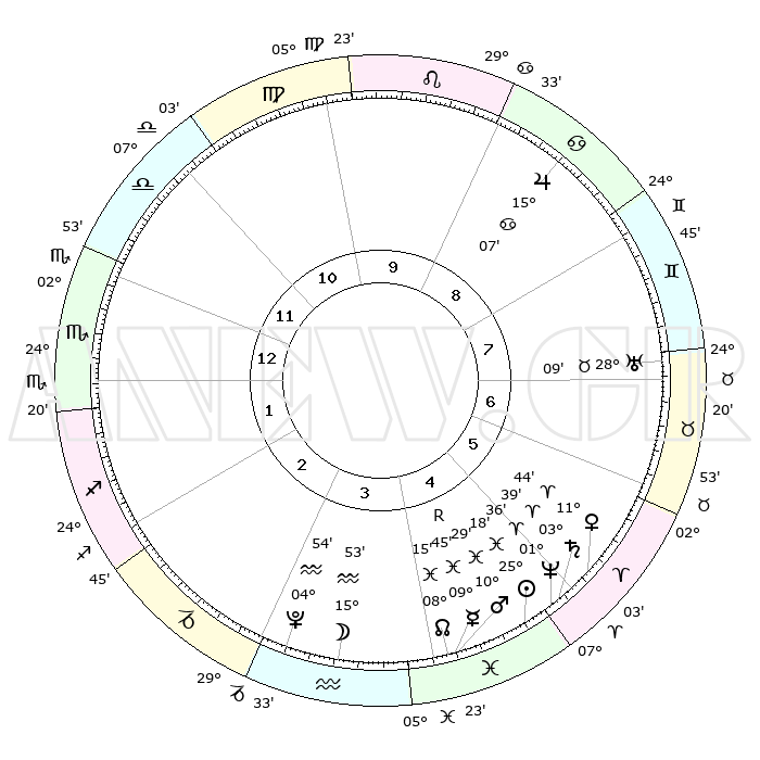 | | ΘΕΣΕΙΣ ΠΛΑΝΗΤΩΝ ΑΣΤΡΟΛΟΓΙΚΟΥ ΧΑΡΤΗ ΤΗΣ ΣΤΙΓΜΗΣ ΑΥΤΗΣ | | | | Πλανήτης | Ζώδιο | Μοίρες | Δεκαήμ. | Σε οίκο | Απόκλιση | | Ακμές των οίκων | | Ηλιος | Ιχθείς | 25°15' | Τρίτο | 5 | 01 S 53 | | 1ος | 06°26' | Σκορπιός | | Σελήνη | Υδροχόος | 15°05' | Δεύτερο | 4 | 18 S 21 | | 2ος | 05°15' | Τοξότης | | Ερμής | Ιχθείς | 09°47'R | Πρώτο | 4 | 05 S 51 | | 3ος | 07°47' | Αιγόκερως | | Αφροδίτη | Κριός | 11°40' | Δεύτερο | 5 | 03 N 40 | | 4ος | 12°26' | Υδροχόος | | Αρης | Ιχθείς | 10°26' | Δεύτερο | 4 | 08 S 39 | | 5ος | 15°13' | Ιχθείς | | Δίας | Καρκίνος | 15°07' | Δεύτερο | 9 | 22 N 56 | | 6ος | 13°15' | Κριός | | Κρόνος | Κριός | 03°39' | Πρώτο | 5 | 00 S 30 | | 7ος | 06°26' | Ταύρος | | Ουρανός | Ταύρος | 28°08' | Τρίτο | 7 | 19 N 34 | | 8ος | 05°15' | Δίδυμοι | | Ποσειδώνας | Κριός | 01°36' | Πρώτο | 5 | 00 S 34 | | 9ος | 07°47' | Καρκίνος | | Πλούτωνας | Υδροχόος | 04°54' | Πρώτο | 3 | 22 S 49 | | 10ος | 12°26' | Λέων | | Β. Δεσμός | Ιχθείς | 08°16' | Πρώτο | 4 | 08 S 28 | | 11ος | 15°13' | Παρθένος | | Ωροσκόπος | Σκορπιός | 06°26' | Πρώτο | | | 12ος | 13°15' | Ζυγός | | Μεσουράνημα | Λέων | 12°26' | Δεύτερο | | | |