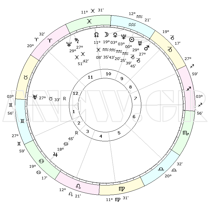| | ΘΕΣΕΙΣ ΠΛΑΝΗΤΩΝ ΑΣΤΡΟΛΟΓΙΚΟΥ ΧΑΡΤΗ ΤΗΣ ΣΤΙΓΜΗΣ ΑΥΤΗΣ | | | | Πλανήτης | Ζώδιο | Μοίρες | Δεκαήμ. | Σε οίκο | Απόκλιση | | Ακμές των οίκων | | Ηλιος | Υδροχόος | 00°19' | Πρώτο | 10 | 20 S 05 | | 1ος | 15°22' | Κριός | | Σελήνη | Υδροχόος | 18°20' | Δεύτερο | 11 | 17 S 06 | | 2ος | 21°39' | Ταύρος | | Ερμής | Αιγόκερως | 29°29' | Τρίτο | 10 | 22 S 14 | | 3ος | 16°54' | Δίδυμοι | | Αφροδίτη | Υδροχόος | 03°35' | Πρώτο | 11 | 20 S 26 | | 4ος | 08°42' | Καρκίνος | | Αρης | Αιγόκερως | 27°40' | Τρίτο | 10 | 21 S 36 | | 5ος | 01°53' | Λέων | | Δίας | Καρκίνος | 18°46'R | Δεύτερο | 4 | 22 N 24 | | 6ος | 01°50' | Παρθένος | | Κρόνος | Ιχθείς | 27°41' | Τρίτο | 12 | 02 S 56 | | 7ος | 15°22' | Ζυγός | | Ουρανός | Ταύρος | 27°33'R | Τρίτο | 2 | 19 N 25 | | 8ος | 21°39' | Σκορπιός | | Ποσειδώνας | Ιχθείς | 29°51' | Τρίτο | 12 | 01 S 16 | | 9ος | 16°54' | Τοξότης | | Πλούτωνας | Υδροχόος | 03°20' | Πρώτο | 11 | 23 S 06 | | 10ος | 08°42' | Αιγόκερως | | Β. Δεσμός | Ιχθείς | 11°09' | Δεύτερο | 12 | 07 S 23 | | 11ος | 01°53' | Υδροχόος | | Ωροσκόπος | Κριός | 15°22' | Δεύτερο | | | 12ος | 01°50' | Ιχθείς | | Μεσουράνημα | Αιγόκερως | 08°42' | Πρώτο | | | |
