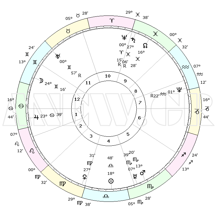 | ΘΕΣΕΙΣ ΠΛΑΝΗΤΩΝ ΑΣΤΡΟΛΟΓΙΚΟΥ ΧΑΡΤΗ ΤΗΣ ΣΤΙΓΜΗΣ ΑΥΤΗΣ | | Πλανήτης | Ζώδιο | Μοίρες | Δεκαήμ. | Σε οίκο | Απόκλιση | | Ακμές των οίκων | Ηλιος | Ζυγός | 18°39' | Δεύτερο | 6 | 07 S 18 | | 1ος | 24°04' | Ταύρος | Σελήνη | Δίδυμοι | 22°09' | Τρίτο | 2 | 28 N 23 | | 2ος | 20°08' | Δίδυμοι | Ερμής | Σκορπιός | 07°26' | Πρώτο | 6 | 15 S 17 | | 3ος | 11°49' | Καρκίνος | Αφροδίτη | Παρθένος | 27°20' | Τρίτο | 5 | 02 N 25 | | 4ος | 04°11' | Λέων | Αρης | Σκορπιός | 13°14' | Δεύτερο | 6 | 15 S 59 | | 5ος | 01°40' | Παρθένος | Δίας | Καρκίνος | 23°38' | Τρίτο | 3 | 21 N 24 | | 6ος | 09°07' | Ζυγός | Κρόνος | Ιχθείς | 27°06'R | Τρίτο | 11 | 03 S 27 | | 7ος | 24°04' | Σκορπιός | Ουρανός | Δίδυμοι | 00°57'R | Πρώτο | 1 | 20 N 08 | | 8ος | 20°08' | Τοξότης | Ποσειδώνας | Κριός | 00°16'R | Πρώτο | 11 | 01 S 09 | | 9ος | 11°49' | Αιγόκερως | Πλούτωνας | Υδροχόος | 01°22'R | Πρώτο | 9 | 23 S 32 | | 10ος | 04°11' | Υδροχόος | Β. Δεσμός | Ιχθείς | 16°28' | Δεύτερο | 11 | 05 S 20 | | 11ος | 01°40' | Ιχθείς | Ωροσκόπος | Ταύρος | 24°04' | Τρίτο | | | 12ος | 09°07' | Κριός | Μεσουράνημα | Υδροχόος | 04°11' | Πρώτο | | | |