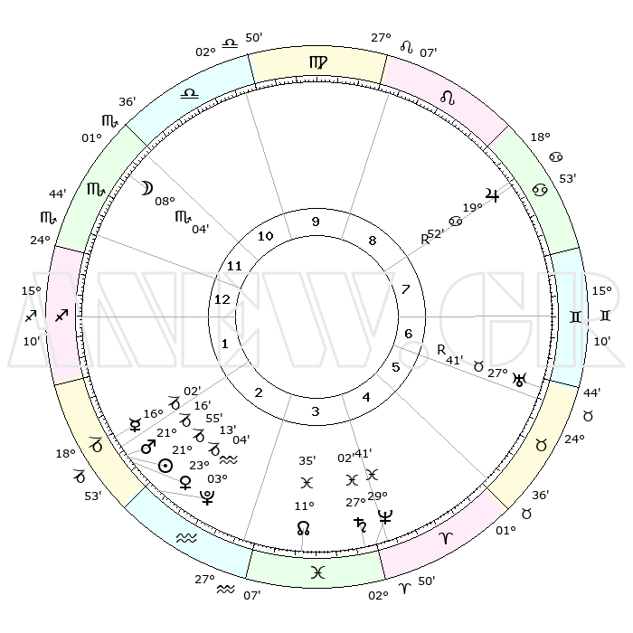 | | ΘΕΣΕΙΣ ΠΛΑΝΗΤΩΝ ΑΣΤΡΟΛΟΓΙΚΟΥ ΧΑΡΤΗ ΤΗΣ ΣΤΙΓΜΗΣ ΑΥΤΗΣ | | | | Πλανήτης | Ζώδιο | Μοίρες | Δεκαήμ. | Σε οίκο | Απόκλιση | | Ακμές των οίκων | | Ηλιος | Αιγόκερως | 21°51' | Τρίτο | 2 | 21 S 40 | | 1ος | 26°00' | Σκορπιός | | Σελήνη | Σκορπιός | 07°18' | Πρώτο | 12 | 18 S 00 | | 2ος | 26°37' | Τοξότης | | Ερμής | Αιγόκερως | 15°55' | Δεύτερο | 2 | 24 S 04 | | 3ος | 01°41' | Υδροχόος | | Αφροδίτη | Αιγόκερως | 23°08' | Τρίτο | 2 | 22 S 20 | | 4ος | 07°36' | Ιχθείς | | Αρης | Αιγόκερως | 21°13' | Τρίτο | 2 | 22 S 42 | | 5ος | 09°06' | Κριός | | Δίας | Καρκίνος | 19°52'R | Δεύτερο | 8 | 22 N 13 | | 6ος | 04°41' | Ταύρος | | Κρόνος | Ιχθείς | 27°01' | Τρίτο | 4 | 03 S 14 | | 7ος | 26°00' | Ταύρος | | Ουρανός | Ταύρος | 27°41'R | Τρίτο | 7 | 19 N 27 | | 8ος | 26°37' | Δίδυμοι | | Ποσειδώνας | Ιχθείς | 29°41' | Τρίτο | 4 | 01 S 21 | | 9ος | 01°41' | Λέων | | Πλούτωνας | Υδροχόος | 03°04' | Πρώτο | 3 | 23 S 09 | | 10ος | 07°36' | Παρθένος | | Β. Δεσμός | Ιχθείς | 11°35' | Δεύτερο | 4 | 07 S 13 | | 11ος | 09°06' | Ζυγός | | Ωροσκόπος | Σκορπιός | 26°00' | Τρίτο | | | 12ος | 04°41' | Σκορπιός | | Μεσουράνημα | Παρθένος | 07°36' | Πρώτο | | | |