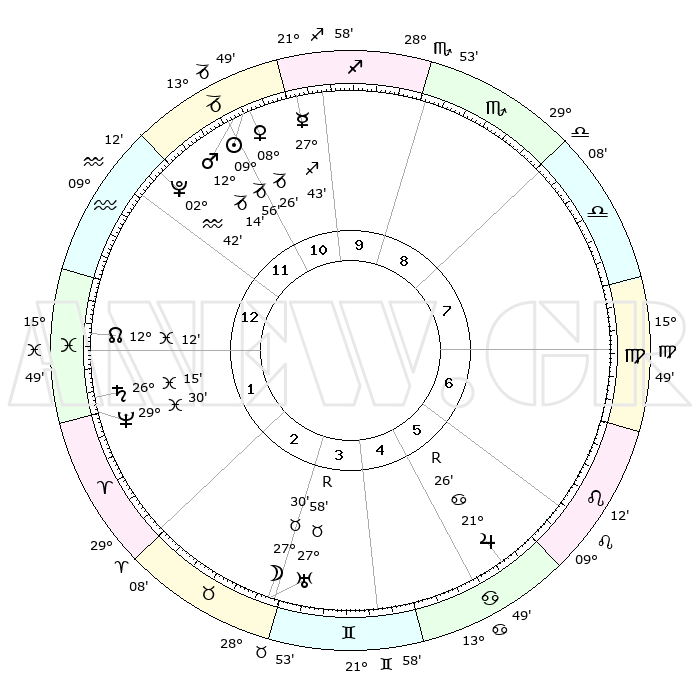| | ΘΕΣΕΙΣ ΠΛΑΝΗΤΩΝ ΑΣΤΡΟΛΟΓΙΚΟΥ ΧΑΡΤΗ ΤΗΣ ΣΤΙΓΜΗΣ ΑΥΤΗΣ | | | | Πλανήτης | Ζώδιο | Μοίρες | Δεκαήμ. | Σε οίκο | Απόκλιση | | Ακμές των οίκων | | Ηλιος | Αιγόκερως | 09°52' | Πρώτο | 11 | 23 S 04 | | 1ος | 06°49' | Υδροχόος | | Σελήνη | Ταύρος | 26°23' | Τρίτο | 3 | 24 N 06 | | 2ος | 21°52' | Ιχθείς | | Ερμής | Τοξότης | 27°36' | Τρίτο | 11 | 23 S 54 | | 3ος | 29°09' | Κριός | | Αφροδίτη | Αιγόκερως | 08°21' | Πρώτο | 11 | 23 S 39 | | 4ος | 26°30' | Ταύρος | | Αρης | Αιγόκερως | 12°10' | Δεύτερο | 12 | 23 S 46 | | 5ος | 18°49' | Δίδυμοι | | Δίας | Καρκίνος | 21°27'R | Τρίτο | 6 | 21 N 58 | | 6ος | 10°33' | Καρκίνος | | Κρόνος | Ιχθείς | 26°15' | Τρίτο | 2 | 03 S 34 | | 7ος | 06°49' | Λέων | | Ουρανός | Ταύρος | 27°58'R | Τρίτο | 4 | 19 N 30 | | 8ος | 21°52' | Παρθένος | | Ποσειδώνας | Ιχθείς | 29°30' | Τρίτο | 2 | 01 S 25 | | 9ος | 29°09' | Ζυγός | | Πλούτωνας | Υδροχόος | 02°42' | Πρώτο | 12 | 23 S 13 | | 10ος | 26°30' | Σκορπιός | | Β. Δεσμός | Ιχθείς | 12°12' | Δεύτερο | 1 | 06 S 59 | | 11ος | 18°49' | Τοξότης | | Ωροσκόπος | Υδροχόος | 06°49' | Πρώτο | | | 12ος | 10°33' | Αιγόκερως | | Μεσουράνημα | Σκορπιός | 26°30' | Τρίτο | | | |