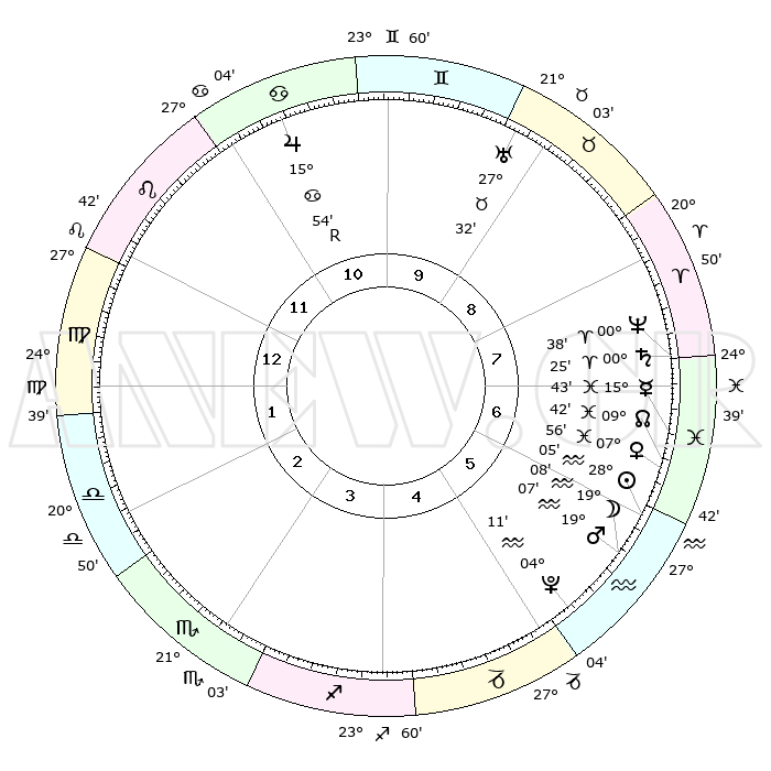 | | ΘΕΣΕΙΣ ΠΛΑΝΗΤΩΝ ΑΣΤΡΟΛΟΓΙΚΟΥ ΧΑΡΤΗ ΤΗΣ ΣΤΙΓΜΗΣ ΑΥΤΗΣ | | | | Πλανήτης | Ζώδιο | Μοίρες | Δεκαήμ. | Σε οίκο | Απόκλιση | | Ακμές των οίκων | | Ηλιος | Υδροχόος | 28°01' | Τρίτο | 6 | 12 S 10 | | 1ος | 03°27' | Παρθένος | | Σελήνη | Υδροχόος | 18°11' | Δεύτερο | 6 | 17 S 09 | | 2ος | 27°40' | Παρθένος | | Ερμής | Ιχθείς | 15°37' | Δεύτερο | 7 | 05 S 16 | | 3ος | 26°38' | Ζυγός | | Αφροδίτη | Ιχθείς | 07°51' | Πρώτο | 7 | 09 S 59 | | 4ος | 29°35' | Σκορπιός | | Αρης | Υδροχόος | 19°03' | Δεύτερο | 6 | 16 S 08 | | 5ος | 03°33' | Αιγόκερως | | Δίας | Καρκίνος | 15°54'R | Δεύτερο | 11 | 22 N 49 | | 6ος | 05°15' | Υδροχόος | | Κρόνος | Κριός | 00°25' | Πρώτο | 8 | 01 S 48 | | 7ος | 03°27' | Ιχθείς | | Ουρανός | Ταύρος | 27°32' | Τρίτο | 9 | 19 N 25 | | 8ος | 27°40' | Ιχθείς | | Ποσειδώνας | Κριός | 00°37' | Πρώτο | 8 | 00 S 57 | | 9ος | 26°38' | Κριός | | Πλούτωνας | Υδροχόος | 04°11' | Πρώτο | 5 | 22 S 56 | | 10ος | 29°35' | Ταύρος | | Β. Δεσμός | Ιχθείς | 09°42' | Πρώτο | 7 | 07 S 56 | | 11ος | 03°33' | Καρκίνος | | Ωροσκόπος | Παρθένος | 03°27' | Πρώτο | | | 12ος | 05°15' | Λέων | | Μεσουράνημα | Ταύρος | 29°35' | Τρίτο | | | |