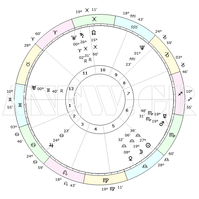 | ΘΕΣΕΙΣ ΠΛΑΝΗΤΩΝ ΑΣΤΡΟΛΟΓΙΚΟΥ ΧΑΡΤΗ ΤΗΣ ΣΤΙΓΜΗΣ ΑΥΤΗΣ | | Πλανήτης | Ζώδιο | Μοίρες | Δεκαήμ. | Σε οίκο | Απόκλιση | | Ακμές των οίκων | Ηλιος | Ζυγός | 27°28' | Τρίτο | 7 | 10 S 34 | | 1ος | 09°50' | Κριός | Σελήνη | Ζυγός | 17°36' | Δεύτερο | 7 | 09 S 16 | | 2ος | 17°37' | Ταύρος | Ερμής | Σκορπιός | 19°38' | Δεύτερο | 8 | 19 S 50 | | 3ος | 13°35' | Δίδυμοι | Αφροδίτη | Ζυγός | 08°23' | Πρώτο | 6 | 01 S 55 | | 4ος | 05°32' | Καρκίνος | Αρης | Σκορπιός | 19°26' | Δεύτερο | 8 | 17 S 51 | | 5ος | 28°21' | Καρκίνος | Δίας | Καρκίνος | 24°22' | Τρίτο | 4 | 21 N 18 | | 6ος | 27°20' | Λέων | Κρόνος | Ιχθείς | 26°32'R | Τρίτο | 12 | 03 S 40 | | 7ος | 09°50' | Ζυγός | Ουρανός | Δίδυμοι | 00°41'R | Πρώτο | 2 | 20 N 05 | | 8ος | 17°37' | Σκορπιός | Ποσειδώνας | Κριός | 00°02'R | Πρώτο | 12 | 01 S 15 | | 9ος | 13°35' | Τοξότης | Πλούτωνας | Υδροχόος | 01°23' | Πρώτο | 11 | 23 S 32 | | 10ος | 05°32' | Αιγόκερως | Β. Δεσμός | Ιχθείς | 16°00' | Δεύτερο | 12 | 05 S 31 | | 11ος | 28°21' | Αιγόκερως | Ωροσκόπος | Κριός | 09°50' | Πρώτο | | | 12ος | 27°20' | Υδροχόος | Μεσουράνημα | Αιγόκερως | 05°32' | Πρώτο | | | |