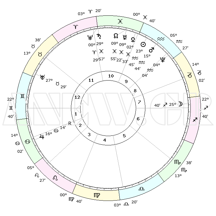 | | ΘΕΣΕΙΣ ΠΛΑΝΗΤΩΝ ΑΣΤΡΟΛΟΓΙΚΟΥ ΧΑΡΤΗ ΤΗΣ ΣΤΙΓΜΗΣ ΑΥΤΗΣ | | | | Πλανήτης | Ζώδιο | Μοίρες | Δεκαήμ. | Σε οίκο | Απόκλιση | | Ακμές των οίκων | | Ηλιος | Υδροχόος | 23°40' | Τρίτο | 10 | 13 S 38 | | 1ος | 19°48' | Ταύρος | | Σελήνη | Τοξότης | 24°41' | Τρίτο | 8 | 28 S 23 | | 2ος | 16°51' | Δίδυμοι | | Ερμής | Ιχθείς | 09°14' | Πρώτο | 11 | 08 S 33 | | 3ος | 08°46' | Καρκίνος | | Αφροδίτη | Ιχθείς | 02°27' | Πρώτο | 11 | 11 S 58 | | 4ος | 00°56' | Λέων | | Αρης | Υδροχόος | 15°40' | Δεύτερο | 10 | 17 S 10 | | 5ος | 27°45' | Λέων | | Δίας | Καρκίνος | 16°14'R | Δεύτερο | 3 | 22 N 46 | | 6ος | 04°24' | Ζυγός | | Κρόνος | Ιχθείς | 29°56' | Τρίτο | 11 | 02 S 00 | | 7ος | 19°48' | Σκορπιός | | Ουρανός | Ταύρος | 27°29' | Τρίτο | 1 | 19 N 25 | | 8ος | 16°51' | Τοξότης | | Ποσειδώνας | Κριός | 00°29' | Πρώτο | 11 | 01 S 01 | | 9ος | 08°46' | Αιγόκερως | | Πλούτωνας | Υδροχόος | 04°03' | Πρώτο | 10 | 22 S 57 | | 10ος | 00°56' | Υδροχόος | | Β. Δεσμός | Ιχθείς | 09°56' | Πρώτο | 11 | 07 S 51 | | 11ος | 27°45' | Υδροχόος | | Ωροσκόπος | Ταύρος | 19°48' | Δεύτερο | | | 12ος | 04°24' | Κριός | | Μεσουράνημα | Υδροχόος | 00°56' | Πρώτο | | | |