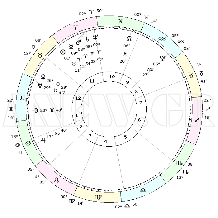 | | ΘΕΣΕΙΣ ΠΛΑΝΗΤΩΝ ΑΣΤΡΟΛΟΓΙΚΟΥ ΧΑΡΤΗ ΤΗΣ ΣΤΙΓΜΗΣ ΑΥΤΗΣ | | | | Πλανήτης | Ζώδιο | Μοίρες | Δεκαήμ. | Σε οίκο | Απόκλιση | | Ακμές των οίκων | | Ηλιος | Ταύρος | 01°07' | Πρώτο | 12 | 11 N 51 | | 1ος | 21°50' | Ταύρος | | Σελήνη | Δίδυμοι | 22°33' | Τρίτο | 2 | 28 N 08 | | 2ος | 18°25' | Δίδυμοι | | Ερμής | Κριός | 09°05' | Πρώτο | 12 | 01 N 13 | | 3ος | 10°13' | Καρκίνος | | Αφροδίτη | Ταύρος | 26°24' | Τρίτο | 1 | 19 N 47 | | 4ος | 02°28' | Λέων | | Αρης | Κριός | 08°51' | Πρώτο | 12 | 02 N 38 | | 5ος | 29°36' | Λέων | | Δίας | Καρκίνος | 17°39' | Δεύτερο | 3 | 22 N 39 | | 6ος | 06°38' | Ζυγός | | Κρόνος | Κριός | 08°08' | Πρώτο | 12 | 01 N 15 | | 7ος | 21°50' | Σκορπιός | | Ουρανός | Ταύρος | 29°45' | Τρίτο | 1 | 19 N 56 | | 8ος | 18°25' | Τοξότης | | Ποσειδώνας | Κριός | 02°56' | Πρώτο | 11 | 00 S 02 | | 9ος | 10°13' | Αιγόκερως | | Πλούτωνας | Υδροχόος | 05°27' | Πρώτο | 10 | 22 S 48 | | 10ος | 02°28' | Υδροχόος | | Β. Δεσμός | Ιχθείς | 06°20' | Πρώτο | 11 | 09 S 11 | | 11ος | 29°36' | Υδροχόος | | Ωροσκόπος | Ταύρος | 21°50' | Τρίτο | | | 12ος | 06°38' | Κριός | | Μεσουράνημα | Υδροχόος | 02°28' | Πρώτο | | | |