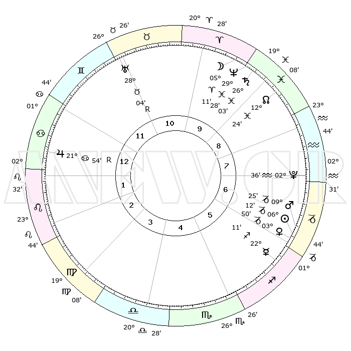 | | ΘΕΣΕΙΣ ΠΛΑΝΗΤΩΝ ΑΣΤΡΟΛΟΓΙΚΟΥ ΧΑΡΤΗ ΤΗΣ ΣΤΙΓΜΗΣ ΑΥΤΗΣ | | | | Πλανήτης | Ζώδιο | Μοίρες | Δεκαήμ. | Σε οίκο | Απόκλιση | | Ακμές των οίκων | | Ηλιος | Αιγόκερως | 05°33' | Πρώτο | 2 | 23 S 19 | | 1ος | 13°09' | Σκορπιός | | Σελήνη | Ιχθείς | 26°23' | Τρίτο | 5 | 00 S 13 | | 2ος | 12°28' | Τοξότης | | Ερμής | Τοξότης | 21°13' | Τρίτο | 2 | 23 S 08 | | 3ος | 15°44' | Αιγόκερως | | Αφροδίτη | Αιγόκερως | 03°01' | Πρώτο | 2 | 23 S 43 | | 4ος | 20°52' | Υδροχόος | | Αρης | Αιγόκερως | 08°56' | Πρώτο | 2 | 23 S 59 | | 5ος | 23°23' | Ιχθείς | | Δίας | Καρκίνος | 21°59'R | Τρίτο | 9 | 21 N 52 | | 6ος | 20°40' | Κριός | | Κρόνος | Ιχθείς | 26°01' | Τρίτο | 5 | 03 S 40 | | 7ος | 13°09' | Ταύρος | | Ουρανός | Ταύρος | 28°05'R | Τρίτο | 7 | 19 N 32 | | 8ος | 12°28' | Δίδυμοι | | Ποσειδώνας | Ιχθείς | 29°27' | Τρίτο | 5 | 01 S 27 | | 9ος | 15°43' | Καρκίνος | | Πλούτωνας | Υδροχόος | 02°35' | Πρώτο | 3 | 23 S 15 | | 10ος | 20°52' | Λέων | | Β. Δεσμός | Ιχθείς | 12°26' | Δεύτερο | 4 | 06 S 54 | | 11ος | 23°23' | Παρθένος | | Ωροσκόπος | Σκορπιός | 13°09' | Δεύτερο | | | 12ος | 20°40' | Ζυγός | | Μεσουράνημα | Λέων | 20°52' | Τρίτο | | | |