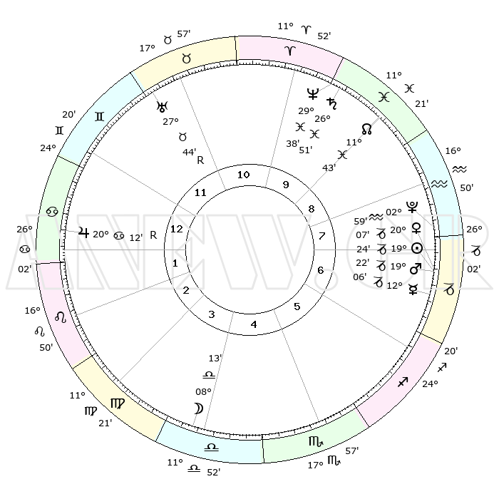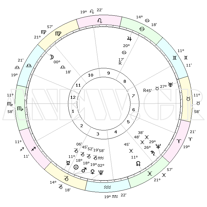 | | ΘΕΣΕΙΣ ΠΛΑΝΗΤΩΝ ΑΣΤΡΟΛΟΓΙΚΟΥ ΧΑΡΤΗ ΤΗΣ ΣΤΙΓΜΗΣ ΑΥΤΗΣ | | | | Πλανήτης | Ζώδιο | Μοίρες | Δεκαήμ. | Σε οίκο | Απόκλιση | | Ακμές των οίκων | | Ηλιος | Αιγόκερως | 19°01' | Δεύτερο | 12 | 22 S 05 | | 1ος | 11°45' | Υδροχόος | | Σελήνη | Ζυγός | 03°38' | Πρώτο | 8 | 03 S 19 | | 2ος | 27°16' | Ιχθείς | | Ερμής | Αιγόκερως | 11°31' | Δεύτερο | 11 | 24 S 18 | | 3ος | 03°37' | Ταύρος | | Αφροδίτη | Αιγόκερως | 19°39' | Δεύτερο | 12 | 22 S 47 | | 4ος | 00°13' | Δίδυμοι | | Αρης | Αιγόκερως | 19°05' | Δεύτερο | 12 | 23 S 00 | | 5ος | 22°18' | Δίδυμοι | | Δίας | Καρκίνος | 20°15'R | Τρίτο | 6 | 22 N 10 | | 6ος | 14°19' | Καρκίνος | | Κρόνος | Ιχθείς | 26°49' | Τρίτο | 1 | 03 S 19 | | 7ος | 11°45' | Λέων | | Ουρανός | Ταύρος | 27°44'R | Τρίτο | 3 | 19 N 28 | | 8ος | 27°16' | Παρθένος | | Ποσειδώνας | Ιχθείς | 29°38' | Τρίτο | 2 | 01 S 22 | | 9ος | 03°37' | Σκορπιός | | Πλούτωνας | Υδροχόος | 02°59' | Πρώτο | 12 | 23 S 10 | | 10ος | 00°13' | Τοξότης | | Β. Δεσμός | Ιχθείς | 11°44' | Δεύτερο | 1 | 07 S 10 | | 11ος | 22°18' | Τοξότης | | Ωροσκόπος | Υδροχόος | 11°45' | Δεύτερο | | | 12ος | 14°19' | Αιγόκερως | | Μεσουράνημα | Τοξότης | 00°13' | Πρώτο | | | |