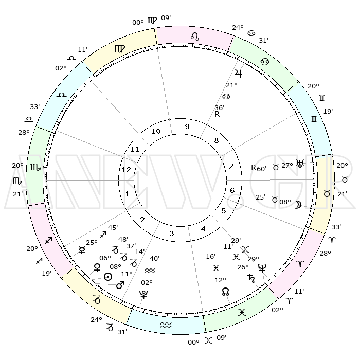 | | ΘΕΣΕΙΣ ΠΛΑΝΗΤΩΝ ΑΣΤΡΟΛΟΓΙΚΟΥ ΧΑΡΤΗ ΤΗΣ ΣΤΙΓΜΗΣ ΑΥΤΗΣ | | | | Πλανήτης | Ζώδιο | Μοίρες | Δεκαήμ. | Σε οίκο | Απόκλιση | | Ακμές των οίκων | | Ηλιος | Αιγόκερως | 08°32' | Πρώτο | 3 | 23 S 09 | | 1ος | 26°59' | Ζυγός | | Σελήνη | Ταύρος | 07°15' | Πρώτο | 7 | 17 N 54 | | 2ος | 25°13' | Σκορπιός | | Ερμής | Τοξότης | 25°38' | Τρίτο | 2 | 23 S 42 | | 3ος | 26°57' | Τοξότης | | Αφροδίτη | Αιγόκερως | 06°42' | Πρώτο | 3 | 23 S 42 | | 4ος | 00°56' | Υδροχόος | | Αρης | Αιγόκερως | 11°10' | Δεύτερο | 3 | 23 S 50 | | 5ος | 03°53' | Ιχθείς | | Δίας | Καρκίνος | 21°37'R | Τρίτο | 9 | 21 N 56 | | 6ος | 02°49' | Κριός | | Κρόνος | Ιχθείς | 26°10' | Τρίτο | 5 | 03 S 36 | | 7ος | 26°59' | Κριός | | Ουρανός | Ταύρος | 28°00'R | Τρίτο | 8 | 19 N 31 | | 8ος | 25°13' | Ταύρος | | Ποσειδώνας | Ιχθείς | 29°29' | Τρίτο | 5 | 01 S 26 | | 9ος | 26°57' | Δίδυμοι | | Πλούτωνας | Υδροχόος | 02°40' | Πρώτο | 4 | 23 S 14 | | 10ος | 00°56' | Λέων | | Β. Δεσμός | Ιχθείς | 12°16' | Δεύτερο | 5 | 06 S 57 | | 11ος | 03°53' | Παρθένος | | Ωροσκόπος | Ζυγός | 26°59' | Τρίτο | | | 12ος | 02°49' | Ζυγός | | Μεσουράνημα | Λέων | 00°56' | Πρώτο | | | |
