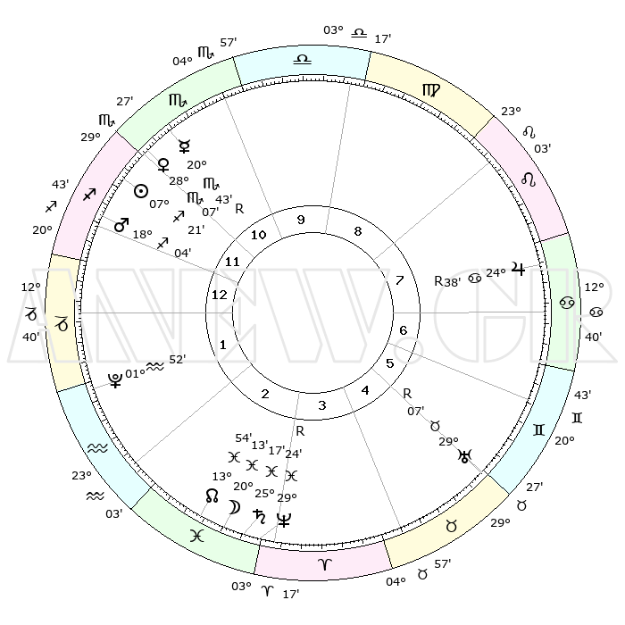 | | ΘΕΣΕΙΣ ΠΛΑΝΗΤΩΝ ΑΣΤΡΟΛΟΓΙΚΟΥ ΧΑΡΤΗ ΤΗΣ ΣΤΙΓΜΗΣ ΑΥΤΗΣ | | | | Πλανήτης | Ζώδιο | Μοίρες | Δεκαήμ. | Σε οίκο | Απόκλιση | | Ακμές των οίκων | | Ηλιος | Τοξότης | 07°19' | Πρώτο | 11 | 21 S 32 | | 1ος | 02°28' | Αιγόκερως | | Σελήνη | Ιχθείς | 19°49' | Δεύτερο | 2 | 03 S 35 | | 2ος | 10°14' | Υδροχόος | | Ερμής | Σκορπιός | 20°43'R | Τρίτο | 11 | 15 S 30 | | 3ος | 20°23' | Ιχθείς | | Αφροδίτη | Σκορπιός | 28°05' | Τρίτο | 11 | 18 S 59 | | 4ος | 23°55' | Κριός | | Αρης | Τοξότης | 18°03' | Δεύτερο | 12 | 23 S 33 | | 5ος | 19°51' | Ταύρος | | Δίας | Καρκίνος | 24°38'R | Τρίτο | 7 | 21 N 21 | | 6ος | 11°30' | Δίδυμοι | | Κρόνος | Ιχθείς | 25°17' | Τρίτο | 3 | 04 S 03 | | 7ος | 02°28' | Καρκίνος | | Ουρανός | Ταύρος | 29°07'R | Τρίτο | 5 | 19 N 45 | | 8ος | 10°14' | Λέων | | Ποσειδώνας | Ιχθείς | 29°24'R | Τρίτο | 3 | 01 S 29 | | 9ος | 20°23' | Παρθένος | | Πλούτωνας | Υδροχόος | 01°52' | Πρώτο | 1 | 23 S 24 | | 10ος | 23°55' | Ζυγός | | Β. Δεσμός | Ιχθείς | 13°54' | Δεύτερο | 2 | 06 S 20 | | 11ος | 19°51' | Σκορπιός | | Ωροσκόπος | Αιγόκερως | 02°28' | Πρώτο | | | 12ος | 11°30' | Τοξότης | | Μεσουράνημα | Ζυγός | 23°55' | Τρίτο | | | |
