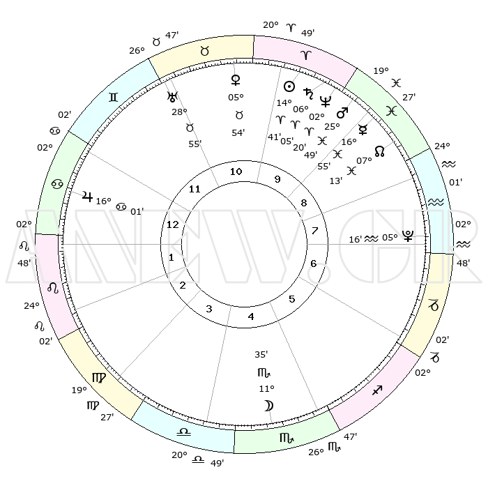 | | ΘΕΣΕΙΣ ΠΛΑΝΗΤΩΝ ΑΣΤΡΟΛΟΓΙΚΟΥ ΧΑΡΤΗ ΤΗΣ ΣΤΙΓΜΗΣ ΑΥΤΗΣ | | | | Πλανήτης | Ζώδιο | Μοίρες | Δεκαήμ. | Σε οίκο | Απόκλιση | | Ακμές των οίκων | | Ηλιος | Κριός | 14°56' | Δεύτερο | 6 | 05 N 53 | | 1ος | 17°44' | Ζυγός | | Σελήνη | Σκορπιός | 14°42' | Δεύτερο | 1 | 20 S 45 | | 2ος | 15°26' | Σκορπιός | | Ερμής | Ιχθείς | 17°11' | Δεύτερο | 5 | 06 S 44 | | 3ος | 16°37' | Τοξότης | | Αφροδίτη | Ταύρος | 06°13' | Πρώτο | 7 | 13 N 19 | | 4ος | 20°05' | Αιγόκερως | | Αρης | Ιχθείς | 26°02' | Τρίτο | 6 | 02 S 32 | | 5ος | 23°02' | Υδροχόος | | Δίας | Καρκίνος | 16°03' | Δεύτερο | 9 | 22 N 50 | | 6ος | 22°38' | Ιχθείς | | Κρόνος | Κριός | 06°07' | Πρώτο | 6 | 00 N 28 | | 7ος | 17°44' | Κριός | | Ουρανός | Ταύρος | 28°56' | Τρίτο | 8 | 19 N 45 | | 8ος | 15°26' | Ταύρος | | Ποσειδώνας | Κριός | 02°21' | Πρώτο | 6 | 00 S 16 | | 9ος | 16°37' | Δίδυμοι | | Πλούτωνας | Υδροχόος | 05°16' | Πρώτο | 4 | 22 S 47 | | 10ος | 20°05' | Καρκίνος | | Β. Δεσμός | Ιχθείς | 07°12' | Πρώτο | 5 | 08 S 52 | | 11ος | 23°02' | Λέων | | Ωροσκόπος | Ζυγός | 17°44' | Δεύτερο | | | 12ος | 22°38' | Παρθένος | | Μεσουράνημα | Καρκίνος | 20°05' | Τρίτο | | | |