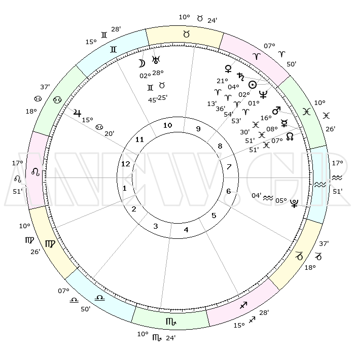 | | ΘΕΣΕΙΣ ΠΛΑΝΗΤΩΝ ΑΣΤΡΟΛΟΓΙΚΟΥ ΧΑΡΤΗ ΤΗΣ ΣΤΙΓΜΗΣ ΑΥΤΗΣ | | | | Πλανήτης | Ζώδιο | Μοίρες | Δεκαήμ. | Σε οίκο | Απόκλιση | | Ακμές των οίκων | | Ηλιος | Κριός | 04°16' | Πρώτο | 4 | 01 N 42 | | 1ος | 05°36' | Τοξότης | | Σελήνη | Δίδυμοι | 22°22' | Τρίτο | 7 | 28 N 17 | | 2ος | 07°34' | Αιγόκερως | | Ερμής | Ιχθείς | 09°16' | Πρώτο | 3 | 08 S 04 | | 3ος | 14°13' | Υδροχόος | | Αφροδίτη | Κριός | 22°54' | Τρίτο | 5 | 08 N 14 | | 4ος | 20°18' | Ιχθείς | | Αρης | Ιχθείς | 17°34' | Δεύτερο | 3 | 05 S 54 | | 5ος | 20°35' | Κριός | | Δίας | Καρκίνος | 15°24' | Δεύτερο | 8 | 22 N 54 | | 6ος | 14°53' | Ταύρος | | Κρόνος | Κριός | 04°47' | Πρώτο | 4 | 00 S 03 | | 7ος | 05°36' | Δίδυμοι | | Ουρανός | Ταύρος | 28°28' | Τρίτο | 6 | 19 N 39 | | 8ος | 07°34' | Καρκίνος | | Ποσειδώνας | Κριός | 01°57' | Πρώτο | 4 | 00 S 26 | | 9ος | 14°13' | Λέων | | Πλούτωνας | Υδροχόος | 05°06' | Πρώτο | 2 | 22 S 48 | | 10ος | 20°18' | Παρθένος | | Β. Δεσμός | Ιχθείς | 07°47' | Πρώτο | 3 | 08 S 39 | | 11ος | 20°35' | Ζυγός | | Ωροσκόπος | Τοξότης | 05°36' | Πρώτο | | | 12ος | 14°53' | Σκορπιός | | Μεσουράνημα | Παρθένος | 20°18' | Τρίτο | | | |