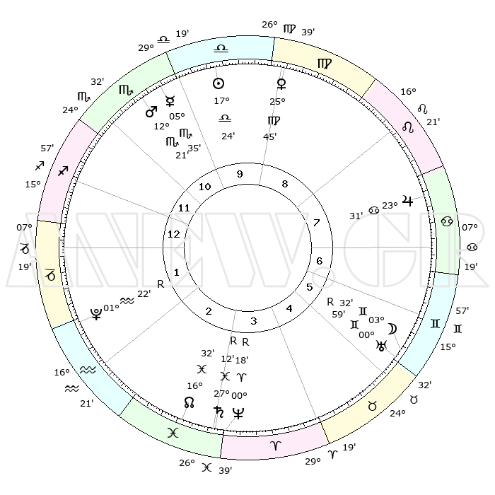 | ΘΕΣΕΙΣ ΠΛΑΝΗΤΩΝ ΑΣΤΡΟΛΟΓΙΚΟΥ ΧΑΡΤΗ ΤΗΣ ΣΤΙΓΜΗΣ ΑΥΤΗΣ | | Πλανήτης | Ζώδιο | Μοίρες | Δεκαήμ. | Σε οίκο | Απόκλιση | | Ακμές των οίκων | Ηλιος | Ζυγός | 17°08' | Δεύτερο | 12 | 06 S 44 | | 1ος | 18°58' | Ζυγός | Σελήνη | Ταύρος | 29°40' | Τρίτο | 8 | 24 N 54 | | 2ος | 16°45' | Σκορπιός | Ερμής | Σκορπιός | 05°13' | Πρώτο | 1 | 14 S 23 | | 3ος | 17°59' | Τοξότης | Αφροδίτη | Παρθένος | 25°26' | Τρίτο | 12 | 03 N 09 | | 4ος | 21°31' | Αιγόκερως | Αρης | Σκορπιός | 12°11' | Δεύτερο | 1 | 15 S 39 | | 5ος | 24°28' | Υδροχόος | Δίας | Καρκίνος | 23°29' | Τρίτο | 10 | 21 N 26 | | 6ος | 23°59' | Ιχθείς | Κρόνος | Ιχθείς | 27°13'R | Τρίτο | 6 | 03 S 24 | | 7ος | 18°58' | Κριός | Ουρανός | Δίδυμοι | 00°59'R | Πρώτο | 8 | 20 N 09 | | 8ος | 16°45' | Ταύρος | Ποσειδώνας | Κριός | 00°18'R | Πρώτο | 6 | 01 S 09 | | 9ος | 17°59' | Δίδυμοι | Πλούτωνας | Υδροχόος | 01°22'R | Πρώτο | 4 | 23 S 32 | | 10ος | 21°31' | Καρκίνος | Β. Δεσμός | Ιχθείς | 16°33' | Δεύτερο | 5 | 05 S 18 | | 11ος | 24°28' | Λέων | Ωροσκόπος | Ζυγός | 18°58' | Δεύτερο | | | 12ος | 23°59' | Παρθένος | Μεσουράνημα | Καρκίνος | 21°31' | Τρίτο | | | |