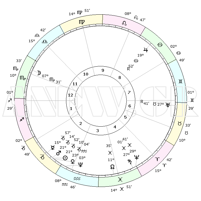 | | ΘΕΣΕΙΣ ΠΛΑΝΗΤΩΝ ΑΣΤΡΟΛΟΓΙΚΟΥ ΧΑΡΤΗ ΤΗΣ ΣΤΙΓΜΗΣ ΑΥΤΗΣ | | | | Πλανήτης | Ζώδιο | Μοίρες | Δεκαήμ. | Σε οίκο | Απόκλιση | | Ακμές των οίκων | | Ηλιος | Αιγόκερως | 21°47' | Τρίτο | 3 | 21 S 40 | | 1ος | 05°17' | Σκορπιός | | Σελήνη | Σκορπιός | 06°27' | Πρώτο | 1 | 17 S 41 | | 2ος | 04°02' | Τοξότης | | Ερμής | Αιγόκερως | 15°49' | Δεύτερο | 3 | 24 S 04 | | 3ος | 06°26' | Αιγόκερως | | Αφροδίτη | Αιγόκερως | 23°03' | Τρίτο | 3 | 22 S 20 | | 4ος | 11°00' | Υδροχόος | | Αρης | Αιγόκερως | 21°10' | Τρίτο | 3 | 22 S 43 | | 5ος | 13°50' | Ιχθείς | | Δίας | Καρκίνος | 19°53'R | Δεύτερο | 9 | 22 N 13 | | 6ος | 11°59' | Κριός | | Κρόνος | Ιχθείς | 27°01' | Τρίτο | 5 | 03 S 14 | | 7ος | 05°17' | Ταύρος | | Ουρανός | Ταύρος | 27°41'R | Τρίτο | 7 | 19 N 27 | | 8ος | 04°02' | Δίδυμοι | | Ποσειδώνας | Ιχθείς | 29°41' | Τρίτο | 5 | 01 S 21 | | 9ος | 06°26' | Καρκίνος | | Πλούτωνας | Υδροχόος | 03°04' | Πρώτο | 3 | 23 S 09 | | 10ος | 11°00' | Λέων | | Β. Δεσμός | Ιχθείς | 11°35' | Δεύτερο | 4 | 07 S 13 | | 11ος | 13°50' | Παρθένος | | Ωροσκόπος | Σκορπιός | 05°17' | Πρώτο | | | 12ος | 11°59' | Ζυγός | | Μεσουράνημα | Λέων | 11°00' | Δεύτερο | | | |