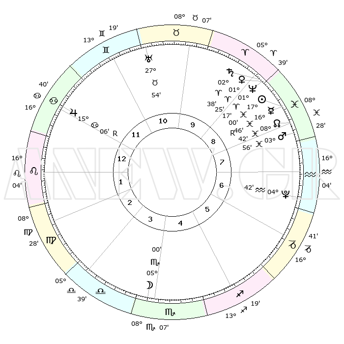 | | ΘΕΣΕΙΣ ΠΛΑΝΗΤΩΝ ΑΣΤΡΟΛΟΓΙΚΟΥ ΧΑΡΤΗ ΤΗΣ ΣΤΙΓΜΗΣ ΑΥΤΗΣ | | | | Πλανήτης | Ζώδιο | Μοίρες | Δεκαήμ. | Σε οίκο | Απόκλιση | | Ακμές των οίκων | | Ηλιος | Ιχθείς | 16°57' | Δεύτερο | 9 | 05 S 09 | | 1ος | 00°33' | Λέων | | Σελήνη | Σκορπιός | 04°21' | Πρώτο | 4 | 17 S 03 | | 2ος | 21°37' | Λέων | | Ερμής | Ιχθείς | 16°49'R | Δεύτερο | 9 | 01 S 51 | | 3ος | 16°44' | Παρθένος | | Αφροδίτη | Κριός | 01°21' | Πρώτο | 9 | 00 S 36 | | 4ος | 17°50' | Ζυγός | | Αρης | Ιχθείς | 03°54' | Πρώτο | 8 | 11 S 06 | | 5ος | 23°52' | Σκορπιός | | Δίας | Καρκίνος | 15°06'R | Δεύτερο | 12 | 22 N 56 | | 6ος | 29°29' | Τοξότης | | Κρόνος | Κριός | 02°38' | Πρώτο | 9 | 00 S 55 | | 7ος | 00°33' | Υδροχόος | | Ουρανός | Ταύρος | 27°53' | Τρίτο | 11 | 19 N 31 | | 8ος | 21°37' | Υδροχόος | | Ποσειδώνας | Κριός | 01°17' | Πρώτο | 9 | 00 S 41 | | 9ος | 16°44' | Ιχθείς | | Πλούτωνας | Υδροχόος | 04°42' | Πρώτο | 7 | 22 S 51 | | 10ος | 17°50' | Κριός | | Β. Δεσμός | Ιχθείς | 08°42' | Πρώτο | 8 | 08 S 18 | | 11ος | 23°52' | Ταύρος | | Ωροσκόπος | Λέων | 00°33' | Πρώτο | | | 12ος | 29°29' | Δίδυμοι | | Μεσουράνημα | Κριός | 17°50' | Δεύτερο | | | |