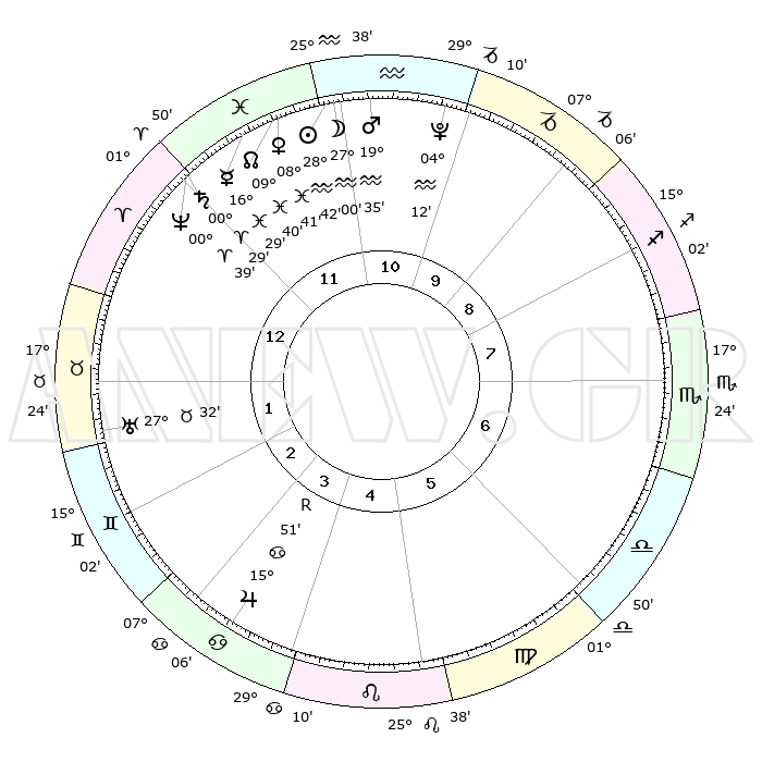 | | ΘΕΣΕΙΣ ΠΛΑΝΗΤΩΝ ΑΣΤΡΟΛΟΓΙΚΟΥ ΧΑΡΤΗ ΤΗΣ ΣΤΙΓΜΗΣ ΑΥΤΗΣ | | | | Πλανήτης | Ζώδιο | Μοίρες | Δεκαήμ. | Σε οίκο | Απόκλιση | | Ακμές των οίκων | | Ηλιος | Υδροχόος | 28°37' | Τρίτο | 12 | 11 S 57 | | 1ος | 07°19' | Κριός | | Σελήνη | Υδροχόος | 26°02' | Τρίτο | 12 | 13 S 57 | | 2ος | 15°46' | Ταύρος | | Ερμής | Ιχθείς | 16°24' | Δεύτερο | 12 | 04 S 50 | | 3ος | 12°05' | Δίδυμοι | | Αφροδίτη | Ιχθείς | 08°36' | Πρώτο | 12 | 09 S 42 | | 4ος | 04°07' | Καρκίνος | | Αρης | Υδροχόος | 19°32' | Δεύτερο | 11 | 15 S 59 | | 5ος | 26°47' | Καρκίνος | | Δίας | Καρκίνος | 15°51'R | Δεύτερο | 4 | 22 N 49 | | 6ος | 25°21' | Λέων | | Κρόνος | Κριός | 00°29' | Πρώτο | 12 | 01 S 47 | | 7ος | 07°19' | Ζυγός | | Ουρανός | Ταύρος | 27°32' | Τρίτο | 2 | 19 N 26 | | 8ος | 15°46' | Σκορπιός | | Ποσειδώνας | Κριός | 00°39' | Πρώτο | 12 | 00 S 57 | | 9ος | 12°05' | Τοξότης | | Πλούτωνας | Υδροχόος | 04°12' | Πρώτο | 11 | 22 S 56 | | 10ος | 04°07' | Αιγόκερως | | Β. Δεσμός | Ιχθείς | 09°40' | Πρώτο | 12 | 07 S 57 | | 11ος | 26°47' | Αιγόκερως | | Ωροσκόπος | Κριός | 07°19' | Πρώτο | | | 12ος | 25°21' | Υδροχόος | | Μεσουράνημα | Αιγόκερως | 04°07' | Πρώτο | | | |