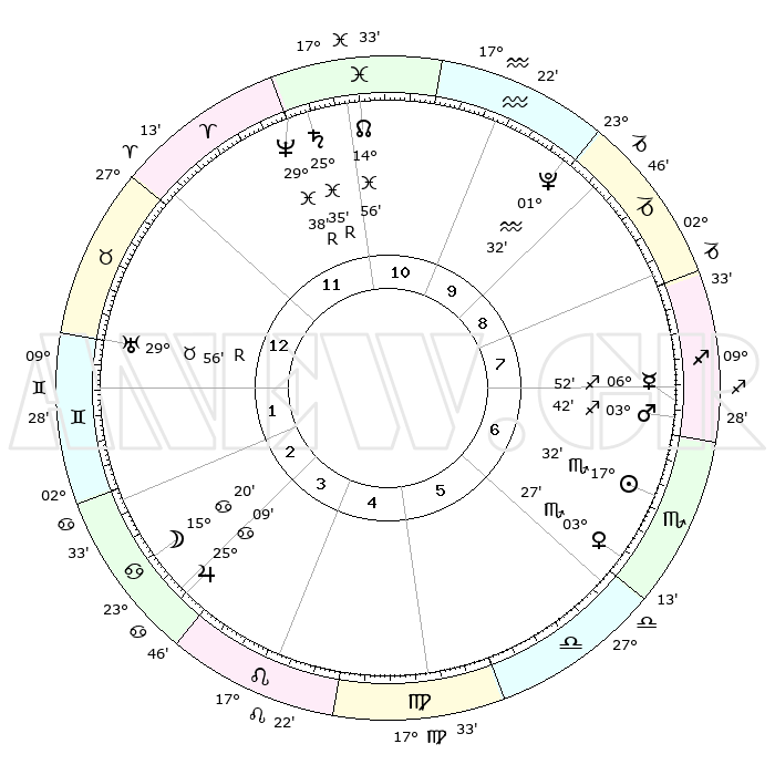 | | ΘΕΣΕΙΣ ΠΛΑΝΗΤΩΝ ΑΣΤΡΟΛΟΓΙΚΟΥ ΧΑΡΤΗ ΤΗΣ ΣΤΙΓΜΗΣ ΑΥΤΗΣ | | | | Πλανήτης | Ζώδιο | Μοίρες | Δεκαήμ. | Σε οίκο | Απόκλιση | | Ακμές των οίκων | | Ηλιος | Σκορπιός | 17°23' | Δεύτερο | 8 | 17 S 01 | | 1ος | 29°52' | Ιχθείς | | Σελήνη | Καρκίνος | 13°21' | Δεύτερο | 4 | 27 N 16 | | 2ος | 10°12' | Ταύρος | | Ερμής | Τοξότης | 06°51' | Πρώτο | 8 | 23 S 48 | | 3ος | 07°37' | Δίδυμοι | | Αφροδίτη | Σκορπιός | 03°16' | Πρώτο | 7 | 11 S 21 | | 4ος | 29°56' | Δίδυμοι | | Αρης | Τοξότης | 03°36' | Πρώτο | 8 | 21 S 20 | | 5ος | 22°14' | Καρκίνος | | Δίας | Καρκίνος | 25°09' | Τρίτο | 5 | 21 N 12 | | 6ος | 19°37' | Λέων | | Κρόνος | Ιχθείς | 25°35'R | Τρίτο | 12 | 04 S 00 | | 7ος | 29°52' | Παρθένος | | Ουρανός | Ταύρος | 29°56'R | Τρίτο | 2 | 19 N 56 | | 8ος | 10°12' | Σκορπιός | | Ποσειδώνας | Ιχθείς | 29°38'R | Τρίτο | 12 | 01 S 24 | | 9ος | 07°37' | Τοξότης | | Πλούτωνας | Υδροχόος | 01°32' | Πρώτο | 11 | 23 S 29 | | 10ος | 29°56' | Τοξότης | | Β. Δεσμός | Ιχθείς | 14°57' | Δεύτερο | 12 | 05 S 56 | | 11ος | 22°14' | Αιγόκερως | | Ωροσκόπος | Ιχθείς | 29°52' | Τρίτο | | | 12ος | 19°37' | Υδροχόος | | Μεσουράνημα | Τοξότης | 29°56' | Τρίτο | | | |