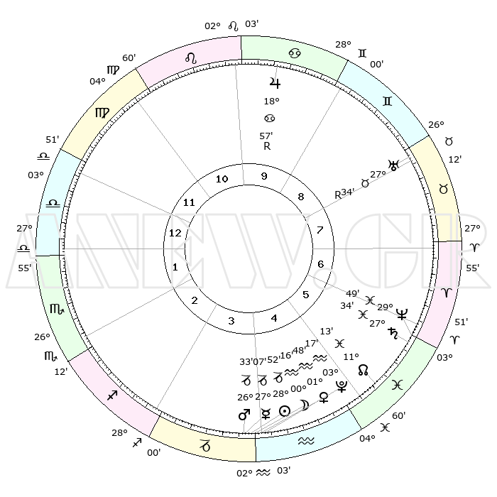 | | ΘΕΣΕΙΣ ΠΛΑΝΗΤΩΝ ΑΣΤΡΟΛΟΓΙΚΟΥ ΧΑΡΤΗ ΤΗΣ ΣΤΙΓΜΗΣ ΑΥΤΗΣ | | | | Πλανήτης | Ζώδιο | Μοίρες | Δεκαήμ. | Σε οίκο | Απόκλιση | | Ακμές των οίκων | | Ηλιος | Αιγόκερως | 28°47' | Τρίτο | 4 | 20 S 24 | | 1ος | 07°09' | Ζυγός | | Σελήνη | Αιγόκερως | 29°23' | Τρίτο | 4 | 23 S 32 | | 2ος | 04°13' | Σκορπιός | | Ερμής | Αιγόκερως | 26°60' | Τρίτο | 4 | 22 S 41 | | 3ος | 04°56' | Τοξότης | | Αφροδίτη | Υδροχόος | 01°42' | Πρώτο | 4 | 20 S 50 | | 4ος | 08°02' | Αιγόκερως | | Αρης | Αιγόκερως | 26°30' | Τρίτο | 4 | 21 S 49 | | 5ος | 10°58' | Υδροχόος | | Δίας | Καρκίνος | 18°58'R | Δεύτερο | 10 | 22 N 22 | | 6ος | 11°06' | Ιχθείς | | Κρόνος | Ιχθείς | 27°34' | Τρίτο | 6 | 03 S 00 | | 7ος | 07°09' | Κριός | | Ουρανός | Ταύρος | 27°34'R | Τρίτο | 8 | 19 N 26 | | 8ος | 04°13' | Ταύρος | | Ποσειδώνας | Ιχθείς | 29°49' | Τρίτο | 6 | 01 S 17 | | 9ος | 04°56' | Δίδυμοι | | Πλούτωνας | Υδροχόος | 03°17' | Πρώτο | 4 | 23 S 06 | | 10ος | 08°02' | Καρκίνος | | Β. Δεσμός | Ιχθείς | 11°13' | Δεύτερο | 6 | 07 S 21 | | 11ος | 10°58' | Λέων | | Ωροσκόπος | Ζυγός | 07°09' | Πρώτο | | | 12ος | 11°06' | Παρθένος | | Μεσουράνημα | Καρκίνος | 08°02' | Πρώτο | | | |