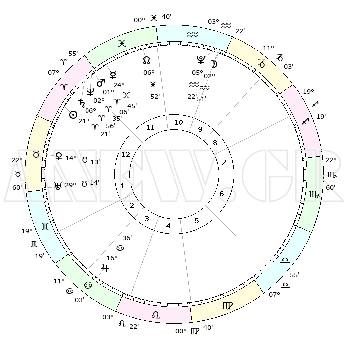 | | ΘΕΣΕΙΣ ΠΛΑΝΗΤΩΝ ΑΣΤΡΟΛΟΓΙΚΟΥ ΧΑΡΤΗ ΤΗΣ ΣΤΙΓΜΗΣ ΑΥΤΗΣ | | | | Πλανήτης | Ζώδιο | Μοίρες | Δεκαήμ. | Σε οίκο | Απόκλιση | | Ακμές των οίκων | | Ηλιος | Κριός | 21°17' | Τρίτο | 1 | 08 N 18 | | 1ος | 12°45' | Κριός | | Σελήνη | Υδροχόος | 01°54' | Πρώτο | 11 | 22 S 43 | | 2ος | 19°45' | Ταύρος | | Ερμής | Ιχθείς | 24°39' | Τρίτο | 12 | 04 S 21 | | 3ος | 15°20' | Δίδυμοι | | Αφροδίτη | Ταύρος | 14°07' | Δεύτερο | 1 | 16 N 04 | | 4ος | 07°12' | Καρκίνος | | Αρης | Κριός | 01°03' | Πρώτο | 12 | 00 S 30 | | 5ος | 00°12' | Λέων | | Δίας | Καρκίνος | 16°35' | Δεύτερο | 4 | 22 N 47 | | 6ος | 29°41' | Λέων | | Κρόνος | Κριός | 06°55' | Πρώτο | 12 | 00 N 47 | | 7ος | 12°45' | Ζυγός | | Ουρανός | Ταύρος | 29°14' | Τρίτο | 2 | 19 N 49 | | 8ος | 19°45' | Σκορπιός | | Ποσειδώνας | Κριός | 02°35' | Πρώτο | 12 | 00 S 11 | | 9ος | 15°20' | Τοξότης | | Πλούτωνας | Υδροχόος | 05°22' | Πρώτο | 11 | 22 S 47 | | 10ος | 07°12' | Αιγόκερως | | Β. Δεσμός | Ιχθείς | 06°52' | Πρώτο | 12 | 08 S 59 | | 11ος | 00°12' | Υδροχόος | | Ωροσκόπος | Κριός | 12°45' | Δεύτερο | | | 12ος | 29°41' | Υδροχόος | | Μεσουράνημα | Αιγόκερως | 07°12' | Πρώτο | | | |