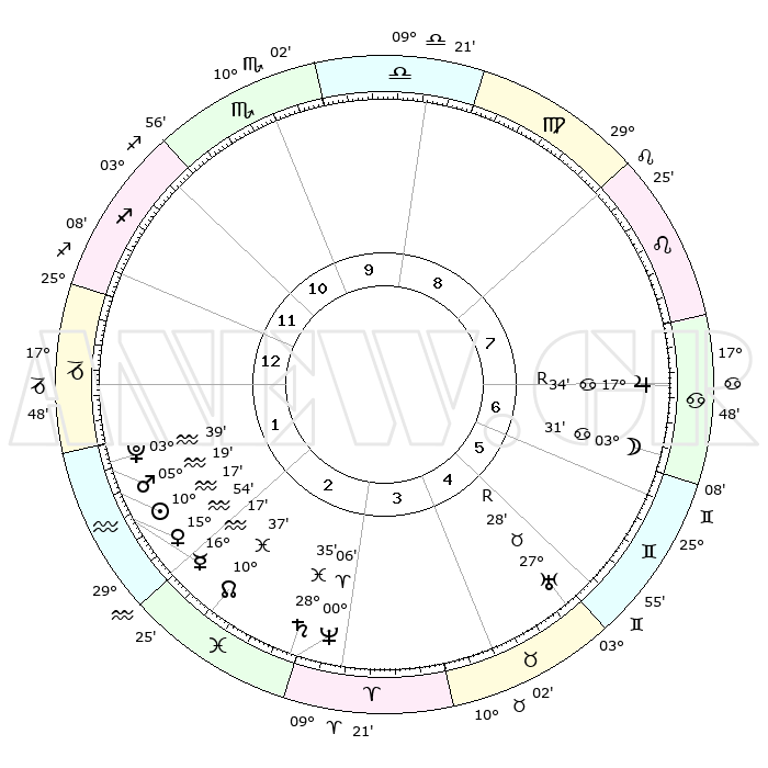 | | ΘΕΣΕΙΣ ΠΛΑΝΗΤΩΝ ΑΣΤΡΟΛΟΓΙΚΟΥ ΧΑΡΤΗ ΤΗΣ ΣΤΙΓΜΗΣ ΑΥΤΗΣ | | | | Πλανήτης | Ζώδιο | Μοίρες | Δεκαήμ. | Σε οίκο | Απόκλιση | | Ακμές των οίκων | | Ηλιος | Υδροχόος | 10°13' | Δεύτερο | 2 | 17 S 41 | | 1ος | 27°35' | Τοξότης | | Σελήνη | Καρκίνος | 02°41' | Πρώτο | 7 | 28 N 11 | | 2ος | 04°07' | Υδροχόος | | Ερμής | Υδροχόος | 16°11' | Δεύτερο | 2 | 17 S 52 | | 3ος | 13°56' | Ιχθείς | | Αφροδίτη | Υδροχόος | 15°50' | Δεύτερο | 2 | 17 S 21 | | 4ος | 18°15' | Κριός | | Αρης | Υδροχόος | 05°16' | Πρώτο | 2 | 19 S 57 | | 5ος | 14°57' | Ταύρος | | Δίας | Καρκίνος | 17°34'R | Δεύτερο | 7 | 22 N 35 | | 6ος | 06°55' | Δίδυμοι | | Κρόνος | Ιχθείς | 28°34' | Τρίτο | 3 | 02 S 34 | | 7ος | 27°35' | Δίδυμοι | | Ουρανός | Ταύρος | 27°28'R | Τρίτο | 5 | 19 N 24 | | 8ος | 04°07' | Λέων | | Ποσειδώνας | Κριός | 00°06' | Πρώτο | 3 | 01 S 10 | | 9ος | 13°56' | Παρθένος | | Πλούτωνας | Υδροχόος | 03°38' | Πρώτο | 1 | 23 S 02 | | 10ος | 18°15' | Ζυγός | | Β. Δεσμός | Ιχθείς | 10°38' | Δεύτερο | 2 | 07 S 35 | | 11ος | 14°57' | Σκορπιός | | Ωροσκόπος | Τοξότης | 27°35' | Τρίτο | | | 12ος | 06°55' | Τοξότης | | Μεσουράνημα | Ζυγός | 18°15' | Δεύτερο | | | |