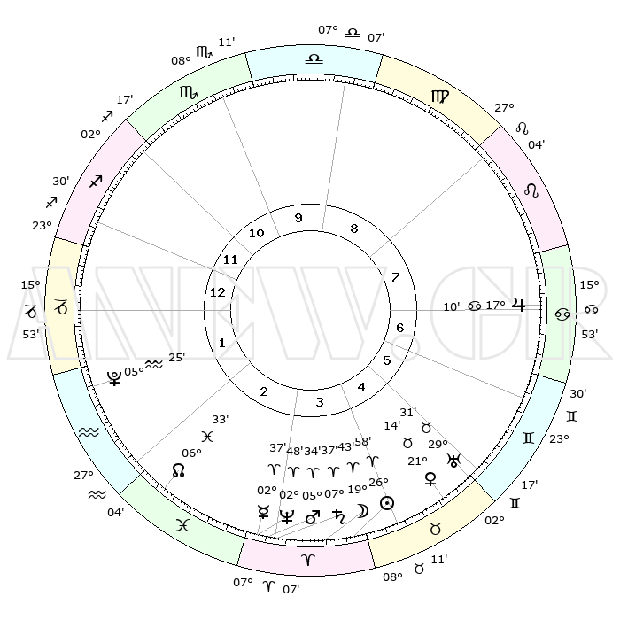 | | ΘΕΣΕΙΣ ΠΛΑΝΗΤΩΝ ΑΣΤΡΟΛΟΓΙΚΟΥ ΧΑΡΤΗ ΤΗΣ ΣΤΙΓΜΗΣ ΑΥΤΗΣ | | | | Πλανήτης | Ζώδιο | Μοίρες | Δεκαήμ. | Σε οίκο | Απόκλιση | | Ακμές των οίκων | | Ηλιος | Κριός | 26°54' | Τρίτο | 4 | 10 N 22 | | 1ος | 23°17' | Τοξότης | | Σελήνη | Κριός | 18°46' | Δεύτερο | 4 | 10 N 27 | | 2ος | 28°47' | Αιγόκερως | | Ερμής | Κριός | 02°32' | Πρώτο | 3 | 01 S 24 | | 3ος | 08°09' | Ιχθείς | | Αφροδίτη | Ταύρος | 21°09' | Τρίτο | 5 | 18 N 17 | | 4ος | 13°03' | Κριός | | Αρης | Κριός | 05°31' | Πρώτο | 3 | 01 N 18 | | 5ος | 10°28' | Ταύρος | | Δίας | Καρκίνος | 17°10' | Δεύτερο | 7 | 22 N 43 | | 6ος | 02°47' | Δίδυμοι | | Κρόνος | Κριός | 07°37' | Πρώτο | 3 | 01 N 03 | | 7ος | 23°17' | Δίδυμοι | | Ουρανός | Ταύρος | 29°31' | Τρίτο | 5 | 19 N 53 | | 8ος | 28°47' | Καρκίνος | | Ποσειδώνας | Κριός | 02°47' | Πρώτο | 3 | 00 S 06 | | 9ος | 08°09' | Παρθένος | | Πλούτωνας | Υδροχόος | 05°25' | Πρώτο | 2 | 22 S 47 | | 10ος | 13°03' | Ζυγός | | Β. Δεσμός | Ιχθείς | 06°34' | Πρώτο | 2 | 09 S 06 | | 11ος | 10°28' | Σκορπιός | | Ωροσκόπος | Τοξότης | 23°17' | Τρίτο | | | 12ος | 02°47' | Τοξότης | | Μεσουράνημα | Ζυγός | 13°03' | Δεύτερο | | | |