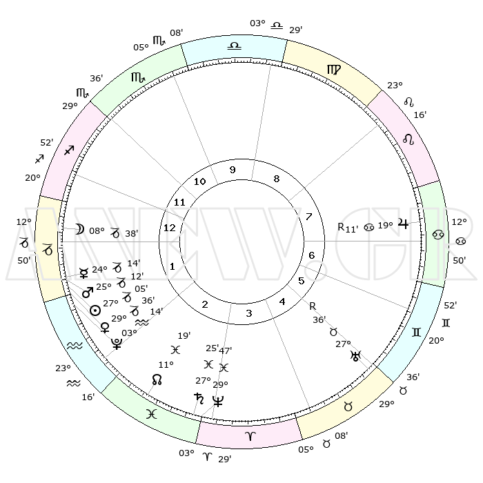| | ΘΕΣΕΙΣ ΠΛΑΝΗΤΩΝ ΑΣΤΡΟΛΟΓΙΚΟΥ ΧΑΡΤΗ ΤΗΣ ΣΤΙΓΜΗΣ ΑΥΤΗΣ | | | | Πλανήτης | Ζώδιο | Μοίρες | Δεκαήμ. | Σε οίκο | Απόκλιση | | Ακμές των οίκων | | Ηλιος | Αιγόκερως | 26°56' | Τρίτο | 2 | 20 S 46 | | 1ος | 28°34' | Σκορπιός | | Σελήνη | Αιγόκερως | 06°56' | Πρώτο | 2 | 27 S 49 | | 2ος | 29°30' | Τοξότης | | Ερμής | Αιγόκερως | 24°00' | Τρίτο | 2 | 23 S 10 | | 3ος | 04°59' | Υδροχόος | | Αφροδίτη | Αιγόκερως | 29°25' | Τρίτο | 2 | 21 S 17 | | 4ος | 10°59' | Ιχθείς | | Αρης | Αιγόκερως | 25°05' | Τρίτο | 2 | 22 S 04 | | 5ος | 12°12' | Κριός | | Δίας | Καρκίνος | 19°12'R | Δεύτερο | 8 | 22 N 20 | | 6ος | 07°26' | Ταύρος | | Κρόνος | Ιχθείς | 27°25' | Τρίτο | 4 | 03 S 04 | | 7ος | 28°34' | Ταύρος | | Ουρανός | Ταύρος | 27°36'R | Τρίτο | 6 | 19 N 26 | | 8ος | 29°30' | Δίδυμοι | | Ποσειδώνας | Ιχθείς | 29°47' | Τρίτο | 4 | 01 S 18 | | 9ος | 04°59' | Λέων | | Πλούτωνας | Υδροχόος | 03°13' | Πρώτο | 2 | 23 S 07 | | 10ος | 10°59' | Παρθένος | | Β. Δεσμός | Ιχθείς | 11°19' | Δεύτερο | 4 | 07 S 19 | | 11ος | 12°12' | Ζυγός | | Ωροσκόπος | Σκορπιός | 28°34' | Τρίτο | | | 12ος | 07°26' | Σκορπιός | | Μεσουράνημα | Παρθένος | 10°59' | Δεύτερο | | | |