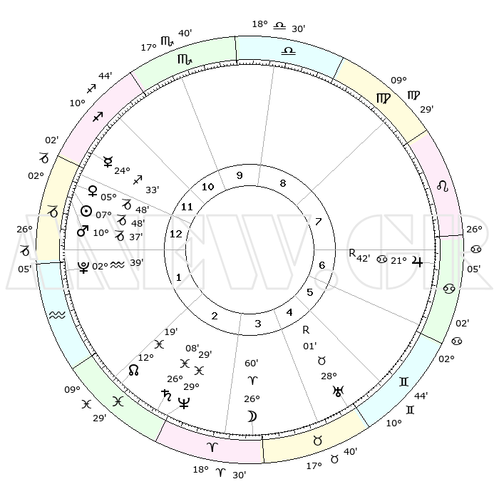 | | ΘΕΣΕΙΣ ΠΛΑΝΗΤΩΝ ΑΣΤΡΟΛΟΓΙΚΟΥ ΧΑΡΤΗ ΤΗΣ ΣΤΙΓΜΗΣ ΑΥΤΗΣ | | | | Πλανήτης | Ζώδιο | Μοίρες | Δεκαήμ. | Σε οίκο | Απόκλιση | | Ακμές των οίκων | | Ηλιος | Αιγόκερως | 07°44' | Πρώτο | 1 | 23 S 12 | | 1ος | 28°59' | Τοξότης | | Σελήνη | Κριός | 25°57' | Τρίτο | 4 | 13 N 21 | | 2ος | 05°53' | Υδροχόος | | Ερμής | Τοξότης | 24°26' | Τρίτο | 12 | 23 S 34 | | 3ος | 15°48' | Ιχθείς | | Αφροδίτη | Αιγόκερως | 05°43' | Πρώτο | 1 | 23 S 43 | | 4ος | 19°54' | Κριός | | Αρης | Αιγόκερως | 10°34' | Δεύτερο | 1 | 23 S 53 | | 5ος | 16°23' | Ταύρος | | Δίας | Καρκίνος | 21°43'R | Τρίτο | 7 | 21 N 55 | | 6ος | 08°15' | Δίδυμοι | | Κρόνος | Ιχθείς | 26°08' | Τρίτο | 3 | 03 S 37 | | 7ος | 28°59' | Δίδυμοι | | Ουρανός | Ταύρος | 28°01'R | Τρίτο | 5 | 19 N 31 | | 8ος | 05°53' | Λέων | | Ποσειδώνας | Ιχθείς | 29°29' | Τρίτο | 3 | 01 S 26 | | 9ος | 15°48' | Παρθένος | | Πλούτωνας | Υδροχόος | 02°38' | Πρώτο | 1 | 23 S 14 | | 10ος | 19°54' | Ζυγός | | Β. Δεσμός | Ιχθείς | 12°19' | Δεύτερο | 2 | 06 S 56 | | 11ος | 16°23' | Σκορπιός | | Ωροσκόπος | Τοξότης | 28°59' | Τρίτο | | | 12ος | 08°15' | Τοξότης | | Μεσουράνημα | Ζυγός | 19°54' | Δεύτερο | | | |