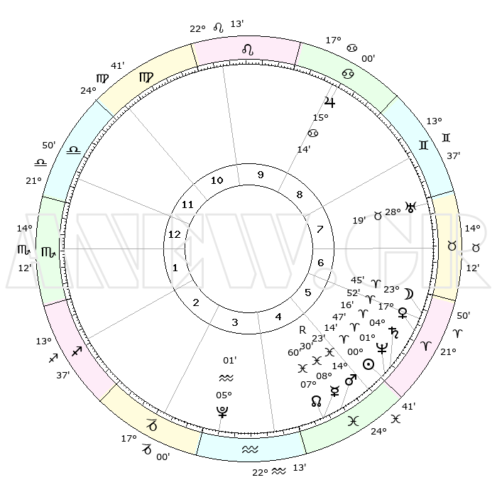 | | ΘΕΣΕΙΣ ΠΛΑΝΗΤΩΝ ΑΣΤΡΟΛΟΓΙΚΟΥ ΧΑΡΤΗ ΤΗΣ ΣΤΙΓΜΗΣ ΑΥΤΗΣ | | | | Πλανήτης | Ζώδιο | Μοίρες | Δεκαήμ. | Σε οίκο | Απόκλιση | | Ακμές των οίκων | | Ηλιος | Κριός | 00°09' | Πρώτο | 6 | 00 N 04 | | 1ος | 23°13' | Ζυγός | | Σελήνη | Κριός | 22°43' | Τρίτο | 6 | 12 N 12 | | 2ος | 21°15' | Σκορπιός | | Ερμής | Ιχθείς | 08°30'R | Πρώτο | 5 | 07 S 28 | | 3ος | 22°44' | Τοξότης | | Αφροδίτη | Κριός | 17°47' | Δεύτερο | 6 | 06 N 11 | | 4ος | 26°29' | Αιγόκερως | | Αρης | Ιχθείς | 14°19' | Δεύτερο | 5 | 07 S 10 | | 5ος | 29°27' | Υδροχόος | | Δίας | Καρκίνος | 15°14' | Δεύτερο | 9 | 22 N 55 | | 6ος | 28°40' | Ιχθείς | | Κρόνος | Κριός | 04°16' | Πρώτο | 6 | 00 S 15 | | 7ος | 23°14' | Κριός | | Ουρανός | Ταύρος | 28°19' | Τρίτο | 8 | 19 N 37 | | 8ος | 21°15' | Ταύρος | | Ποσειδώνας | Κριός | 01°47' | Πρώτο | 6 | 00 S 29 | | 9ος | 22°43' | Δίδυμοι | | Πλούτωνας | Υδροχόος | 05°01' | Πρώτο | 4 | 22 S 49 | | 10ος | 26°29' | Καρκίνος | | Β. Δεσμός | Ιχθείς | 07°60' | Πρώτο | 5 | 08 S 34 | | 11ος | 29°27' | Λέων | | Ωροσκόπος | Ζυγός | 23°13' | Τρίτο | | | 12ος | 28°40' | Παρθένος | | Μεσουράνημα | Καρκίνος | 26°29' | Τρίτο | | | |