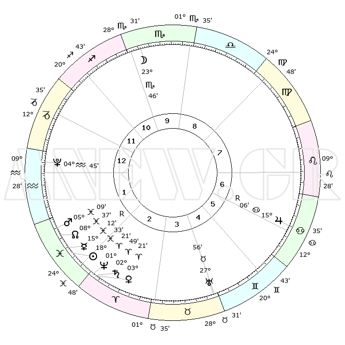 | | ΘΕΣΕΙΣ ΠΛΑΝΗΤΩΝ ΑΣΤΡΟΛΟΓΙΚΟΥ ΧΑΡΤΗ ΤΗΣ ΣΤΙΓΜΗΣ ΑΥΤΗΣ | | | | Πλανήτης | Ζώδιο | Μοίρες | Δεκαήμ. | Σε οίκο | Απόκλιση | | Ακμές των οίκων | | Ηλιος | Ιχθείς | 17°51' | Δεύτερο | 10 | 04 S 48 | | 1ος | 04°09' | Καρκίνος | | Σελήνη | Σκορπιός | 15°24' | Δεύτερο | 5 | 21 S 04 | | 2ος | 24°44' | Καρκίνος | | Ερμής | Ιχθείς | 15°54'R | Δεύτερο | 10 | 02 S 16 | | 3ος | 16°50' | Λέων | | Αφροδίτη | Κριός | 02°29' | Πρώτο | 10 | 00 S 08 | | 4ος | 13°50' | Παρθένος | | Αρης | Ιχθείς | 04°37' | Πρώτο | 9 | 10 S 50 | | 5ος | 18°23' | Ζυγός | | Δίας | Καρκίνος | 15°06'R | Δεύτερο | 1 | 22 N 56 | | 6ος | 28°02' | Σκορπιός | | Κρόνος | Κριός | 02°44' | Πρώτο | 10 | 00 S 52 | | 7ος | 04°09' | Αιγόκερως | | Ουρανός | Ταύρος | 27°55' | Τρίτο | 11 | 19 N 31 | | 8ος | 24°44' | Αιγόκερως | | Ποσειδώνας | Κριός | 01°19' | Πρώτο | 10 | 00 S 40 | | 9ος | 16°50' | Υδροχόος | | Πλούτωνας | Υδροχόος | 04°44' | Πρώτο | 8 | 22 S 51 | | 10ος | 13°50' | Ιχθείς | | Β. Δεσμός | Ιχθείς | 08°39' | Πρώτο | 9 | 08 S 19 | | 11ος | 18°23' | Κριός | | Ωροσκόπος | Καρκίνος | 04°09' | Πρώτο | | | 12ος | 28°02' | Ταύρος | | Μεσουράνημα | Ιχθείς | 13°50' | Δεύτερο | | | |