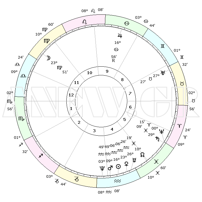 | | ΘΕΣΕΙΣ ΠΛΑΝΗΤΩΝ ΑΣΤΡΟΛΟΓΙΚΟΥ ΧΑΡΤΗ ΤΗΣ ΣΤΙΓΜΗΣ ΑΥΤΗΣ | | | | Πλανήτης | Ζώδιο | Μοίρες | Δεκαήμ. | Σε οίκο | Απόκλιση | | Ακμές των οίκων | | Ηλιος | Υδροχόος | 16°02' | Δεύτερο | 5 | 16 S 02 | | 1ος | 10°48' | Ζυγός | | Σελήνη | Παρθένος | 22°51' | Τρίτο | 12 | 01 N 41 | | 2ος | 08°06' | Σκορπιός | | Ερμής | Υδροχόος | 26°18' | Τρίτο | 5 | 14 S 14 | | 3ος | 08°57' | Τοξότης | | Αφροδίτη | Υδροχόος | 23°01' | Τρίτο | 5 | 15 S 11 | | 4ος | 12°10' | Αιγόκερως | | Αρης | Υδροχόος | 09°45' | Πρώτο | 4 | 18 S 49 | | 5ος | 15°05' | Υδροχόος | | Δίας | Καρκίνος | 16°57'R | Δεύτερο | 10 | 22 N 40 | | 6ος | 15°04' | Ιχθείς | | Κρόνος | Ιχθείς | 29°09' | Τρίτο | 6 | 02 S 20 | | 7ος | 10°48' | Κριός | | Ουρανός | Ταύρος | 27°27' | Τρίτο | 8 | 19 N 24 | | 8ος | 08°06' | Ταύρος | | Ποσειδώνας | Κριός | 00°15' | Πρώτο | 6 | 01 S 06 | | 9ος | 08°57' | Δίδυμοι | | Πλούτωνας | Υδροχόος | 03°49' | Πρώτο | 4 | 23 S 00 | | 10ος | 12°10' | Καρκίνος | | Β. Δεσμός | Ιχθείς | 10°19' | Δεύτερο | 5 | 07 S 42 | | 11ος | 15°05' | Λέων | | Ωροσκόπος | Ζυγός | 10°48' | Δεύτερο | | | 12ος | 15°04' | Παρθένος | | Μεσουράνημα | Καρκίνος | 12°10' | Δεύτερο | | | |