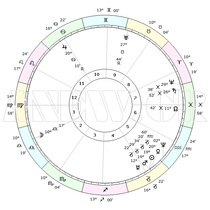 | | ΘΕΣΕΙΣ ΠΛΑΝΗΤΩΝ ΑΣΤΡΟΛΟΓΙΚΟΥ ΧΑΡΤΗ ΤΗΣ ΣΤΙΓΜΗΣ ΑΥΤΗΣ | | | | Πλανήτης | Ζώδιο | Μοίρες | Δεκαήμ. | Σε οίκο | Απόκλιση | | Ακμές των οίκων | | Ηλιος | Αιγόκερως | 18°52' | Δεύτερο | 2 | 22 S 06 | | 1ος | 12°53' | Τοξότης | | Σελήνη | Ζυγός | 01°37' | Πρώτο | 10 | 02 S 21 | | 2ος | 16°09' | Αιγόκερως | | Ερμής | Αιγόκερως | 11°16' | Δεύτερο | 1 | 24 S 19 | | 3ος | 24°01' | Υδροχόος | | Αφροδίτη | Αιγόκερως | 19°27' | Δεύτερο | 2 | 22 S 49 | | 4ος | 29°53' | Ιχθείς | | Αρης | Αιγόκερως | 18°57' | Δεύτερο | 2 | 23 S 01 | | 5ος | 29°02' | Κριός | | Δίας | Καρκίνος | 20°16'R | Τρίτο | 8 | 22 N 10 | | 6ος | 22°25' | Ταύρος | | Κρόνος | Ιχθείς | 26°49' | Τρίτο | 3 | 03 S 19 | | 7ος | 12°53' | Δίδυμοι | | Ουρανός | Ταύρος | 27°45'R | Τρίτο | 6 | 19 N 28 | | 8ος | 16°09' | Καρκίνος | | Ποσειδώνας | Ιχθείς | 29°38' | Τρίτο | 3 | 01 S 22 | | 9ος | 24°01' | Λέων | | Πλούτωνας | Υδροχόος | 02°58' | Πρώτο | 2 | 23 S 10 | | 10ος | 29°53' | Παρθένος | | Β. Δεσμός | Ιχθείς | 11°44' | Δεύτερο | 3 | 07 S 09 | | 11ος | 29°02' | Ζυγός | | Ωροσκόπος | Τοξότης | 12°53' | Δεύτερο | | | 12ος | 22°25' | Σκορπιός | | Μεσουράνημα | Παρθένος | 29°53' | Τρίτο | | | |