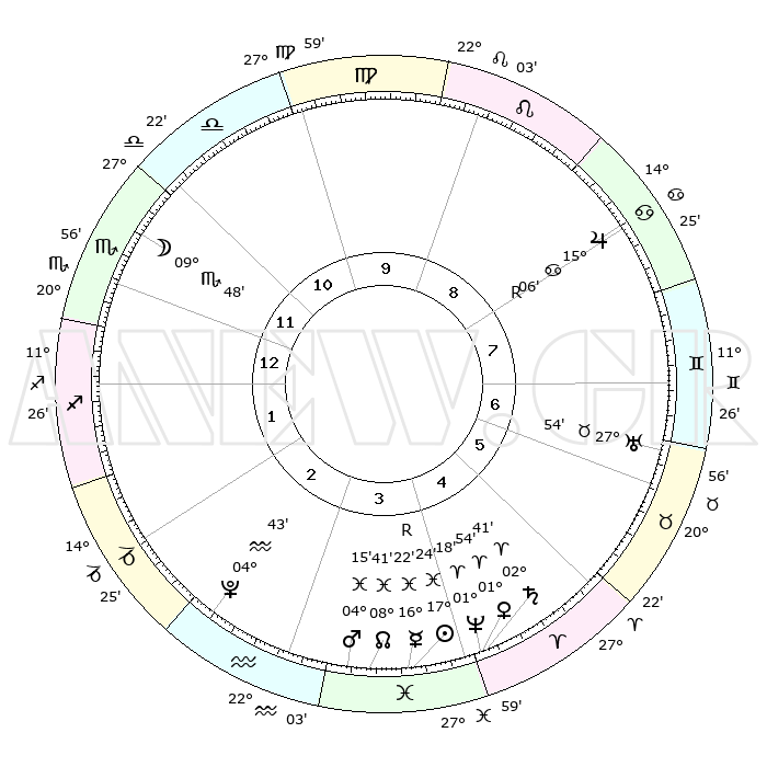 | | ΘΕΣΕΙΣ ΠΛΑΝΗΤΩΝ ΑΣΤΡΟΛΟΓΙΚΟΥ ΧΑΡΤΗ ΤΗΣ ΣΤΙΓΜΗΣ ΑΥΤΗΣ | | | | Πλανήτης | Ζώδιο | Μοίρες | Δεκαήμ. | Σε οίκο | Απόκλιση | | Ακμές των οίκων | | Ηλιος | Ιχθείς | 17°20' | Δεύτερο | 4 | 05 S 00 | | 1ος | 21°25' | Σκορπιός | | Σελήνη | Σκορπιός | 08°59' | Πρώτο | 12 | 18 S 49 | | 2ος | 21°31' | Τοξότης | | Ερμής | Ιχθείς | 16°26'R | Δεύτερο | 4 | 02 S 01 | | 3ος | 25°52' | Αιγόκερως | | Αφροδίτη | Κριός | 01°49' | Πρώτο | 4 | 00 S 24 | | 4ος | 01°34' | Ιχθείς | | Αρης | Ιχθείς | 04°11' | Πρώτο | 4 | 10 S 59 | | 5ος | 03°30' | Κριός | | Δίας | Καρκίνος | 15°06'R | Δεύτερο | 8 | 22 N 56 | | 6ος | 29°43' | Κριός | | Κρόνος | Κριός | 02°40' | Πρώτο | 4 | 00 S 53 | | 7ος | 21°25' | Ταύρος | | Ουρανός | Ταύρος | 27°54' | Τρίτο | 7 | 19 N 31 | | 8ος | 21°31' | Δίδυμοι | | Ποσειδώνας | Κριός | 01°18' | Πρώτο | 4 | 00 S 41 | | 9ος | 25°52' | Καρκίνος | | Πλούτωνας | Υδροχόος | 04°43' | Πρώτο | 3 | 22 S 51 | | 10ος | 01°34' | Παρθένος | | Β. Δεσμός | Ιχθείς | 08°41' | Πρώτο | 4 | 08 S 19 | | 11ος | 03°30' | Ζυγός | | Ωροσκόπος | Σκορπιός | 21°25' | Τρίτο | | | 12ος | 29°43' | Ζυγός | | Μεσουράνημα | Παρθένος | 01°34' | Πρώτο | | | |