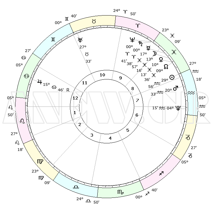 | | ΘΕΣΕΙΣ ΠΛΑΝΗΤΩΝ ΑΣΤΡΟΛΟΓΙΚΟΥ ΧΑΡΤΗ ΤΗΣ ΣΤΙΓΜΗΣ ΑΥΤΗΣ | | | | Πλανήτης | Ζώδιο | Μοίρες | Δεκαήμ. | Σε οίκο | Απόκλιση | | Ακμές των οίκων | | Ηλιος | Υδροχόος | 29°51' | Τρίτο | 9 | 11 S 31 | | 1ος | 13°35' | Καρκίνος | | Σελήνη | Ιχθείς | 12°16' | Δεύτερο | 9 | 06 S 41 | | 2ος | 04°00' | Λέων | | Ερμής | Ιχθείς | 17°52' | Δεύτερο | 9 | 03 S 59 | | 3ος | 27°00' | Λέων | | Αφροδίτη | Ιχθείς | 10°08' | Δεύτερο | 9 | 09 S 07 | | 4ος | 25°34' | Παρθένος | | Αρης | Υδροχόος | 20°29' | Τρίτο | 8 | 15 S 41 | | 5ος | 01°11' | Σκορπιός | | Δίας | Καρκίνος | 15°47'R | Δεύτερο | 1 | 22 N 50 | | 6ος | 09°36' | Τοξότης | | Κρόνος | Κριός | 00°37' | Πρώτο | 10 | 01 S 43 | | 7ος | 13°35' | Αιγόκερως | | Ουρανός | Ταύρος | 27°33' | Τρίτο | 11 | 19 N 26 | | 8ος | 04°00' | Υδροχόος | | Ποσειδώνας | Κριός | 00°41' | Πρώτο | 10 | 00 S 56 | | 9ος | 27°00' | Υδροχόος | | Πλούτωνας | Υδροχόος | 04°14' | Πρώτο | 8 | 22 S 55 | | 10ος | 25°34' | Ιχθείς | | Β. Δεσμός | Ιχθείς | 09°36' | Πρώτο | 9 | 07 S 58 | | 11ος | 01°11' | Ταύρος | | Ωροσκόπος | Καρκίνος | 13°35' | Δεύτερο | | | 12ος | 09°36' | Δίδυμοι | | Μεσουράνημα | Ιχθείς | 25°34' | Τρίτο | | | |