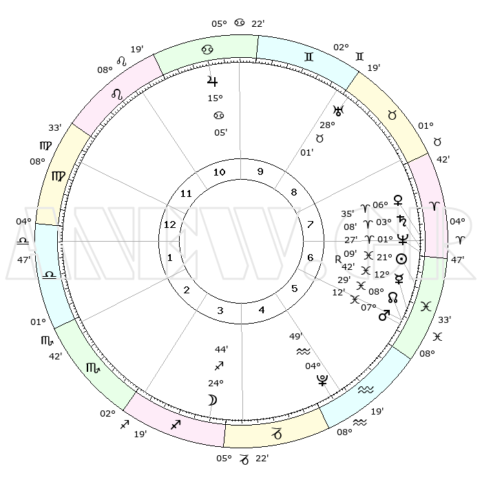 | | ΘΕΣΕΙΣ ΠΛΑΝΗΤΩΝ ΑΣΤΡΟΛΟΓΙΚΟΥ ΧΑΡΤΗ ΤΗΣ ΣΤΙΓΜΗΣ ΑΥΤΗΣ | | | | Πλανήτης | Ζώδιο | Μοίρες | Δεκαήμ. | Σε οίκο | Απόκλιση | | Ακμές των οίκων | | Ηλιος | Ιχθείς | 21°06' | Τρίτο | 7 | 03 S 32 | | 1ος | 19°01' | Παρθένος | | Σελήνη | Τοξότης | 24°06' | Τρίτο | 4 | 28 S 23 | | 2ος | 14°44' | Ζυγός | | Ερμής | Ιχθείς | 12°45'R | Δεύτερο | 6 | 03 S 54 | | 3ος | 14°42' | Σκορπιός | | Αφροδίτη | Κριός | 06°31' | Πρώτο | 7 | 01 N 32 | | 4ος | 17°37' | Τοξότης | | Αρης | Ιχθείς | 07°10' | Πρώτο | 6 | 09 S 53 | | 5ος | 20°50' | Αιγόκερως | | Δίας | Καρκίνος | 15°05' | Δεύτερο | 10 | 22 N 56 | | 6ος | 21°42' | Υδροχόος | | Κρόνος | Κριός | 03°08' | Πρώτο | 7 | 00 S 42 | | 7ος | 19°01' | Ιχθείς | | Ουρανός | Ταύρος | 28°01' | Τρίτο | 9 | 19 N 32 | | 8ος | 14°44' | Κριός | | Ποσειδώνας | Κριός | 01°27' | Πρώτο | 7 | 00 S 38 | | 9ος | 14°42' | Ταύρος | | Πλούτωνας | Υδροχόος | 04°48' | Πρώτο | 5 | 22 S 50 | | 10ος | 17°37' | Δίδυμοι | | Β. Δεσμός | Ιχθείς | 08°29' | Πρώτο | 6 | 08 S 23 | | 11ος | 20°50' | Καρκίνος | | Ωροσκόπος | Παρθένος | 19°01' | Δεύτερο | | | 12ος | 21°42' | Λέων | | Μεσουράνημα | Δίδυμοι | 17°37' | Δεύτερο | | | |