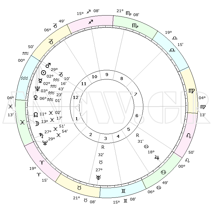 | | ΘΕΣΕΙΣ ΠΛΑΝΗΤΩΝ ΑΣΤΡΟΛΟΓΙΚΟΥ ΧΑΡΤΗ ΤΗΣ ΣΤΙΓΜΗΣ ΑΥΤΗΣ | | | | Πλανήτης | Ζώδιο | Μοίρες | Δεκαήμ. | Σε οίκο | Απόκλιση | | Ακμές των οίκων | | Ηλιος | Υδροχόος | 02°12' | Πρώτο | 1 | 19 S 40 | | 1ος | 27°37' | Αιγόκερως | | Σελήνη | Ιχθείς | 12°17' | Δεύτερο | 2 | 06 S 42 | | 2ος | 11°19' | Ιχθείς | | Ερμής | Υδροχόος | 02°35' | Πρώτο | 1 | 21 S 35 | | 3ος | 20°07' | Κριός | | Αφροδίτη | Υδροχόος | 05°55' | Πρώτο | 1 | 19 S 55 | | 4ος | 18°60' | Ταύρος | | Αρης | Αιγόκερως | 29°06' | Τρίτο | 1 | 21 S 19 | | 5ος | 11°56' | Δίδυμοι | | Δίας | Καρκίνος | 18°32'R | Δεύτερο | 6 | 22 N 26 | | 6ος | 03°17' | Καρκίνος | | Κρόνος | Ιχθείς | 27°51' | Τρίτο | 2 | 02 S 52 | | 7ος | 27°37' | Καρκίνος | | Ουρανός | Ταύρος | 27°32'R | Τρίτο | 4 | 19 N 25 | | 8ος | 11°19' | Παρθένος | | Ποσειδώνας | Ιχθείς | 29°54' | Τρίτο | 2 | 01 S 15 | | 9ος | 20°07' | Ζυγός | | Πλούτωνας | Υδροχόος | 03°23' | Πρώτο | 1 | 23 S 05 | | 10ος | 18°60' | Σκορπιός | | Β. Δεσμός | Ιχθείς | 11°03' | Δεύτερο | 1 | 07 S 25 | | 11ος | 11°56' | Τοξότης | | Ωροσκόπος | Αιγόκερως | 27°37' | Τρίτο | | | 12ος | 03°17' | Αιγόκερως | | Μεσουράνημα | Σκορπιός | 18°60' | Δεύτερο | | | |