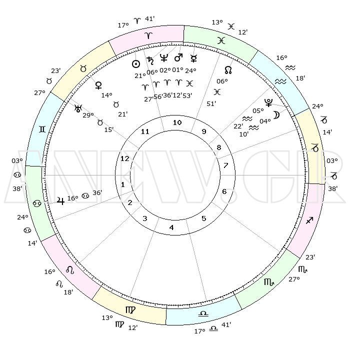 | | ΘΕΣΕΙΣ ΠΛΑΝΗΤΩΝ ΑΣΤΡΟΛΟΓΙΚΟΥ ΧΑΡΤΗ ΤΗΣ ΣΤΙΓΜΗΣ ΑΥΤΗΣ | | | | Πλανήτης | Ζώδιο | Μοίρες | Δεκαήμ. | Σε οίκο | Απόκλιση | | Ακμές των οίκων | | Ηλιος | Κριός | 21°23' | Τρίτο | 11 | 08 N 20 | | 1ος | 08°49' | Δίδυμοι | | Σελήνη | Υδροχόος | 03°18' | Πρώτο | 9 | 22 S 17 | | 2ος | 02°00' | Καρκίνος | | Ερμής | Ιχθείς | 24°48' | Τρίτο | 11 | 04 S 17 | | 3ος | 23°13' | Καρκίνος | | Αφροδίτη | Ταύρος | 14°16' | Δεύτερο | 12 | 16 N 07 | | 4ος | 16°45' | Λέων | | Αρης | Κριός | 01°08' | Πρώτο | 11 | 00 S 28 | | 5ος | 16°48' | Παρθένος | | Δίας | Καρκίνος | 16°36' | Δεύτερο | 2 | 22 N 47 | | 6ος | 26°25' | Ζυγός | | Κρόνος | Κριός | 06°56' | Πρώτο | 11 | 00 N 47 | | 7ος | 08°49' | Τοξότης | | Ουρανός | Ταύρος | 29°14' | Τρίτο | 12 | 19 N 49 | | 8ος | 02°00' | Αιγόκερως | | Ποσειδώνας | Κριός | 02°35' | Πρώτο | 11 | 00 S 10 | | 9ος | 23°13' | Αιγόκερως | | Πλούτωνας | Υδροχόος | 05°22' | Πρώτο | 9 | 22 S 47 | | 10ος | 16°45' | Υδροχόος | | Β. Δεσμός | Ιχθείς | 06°52' | Πρώτο | 10 | 08 S 59 | | 11ος | 16°48' | Ιχθείς | | Ωροσκόπος | Δίδυμοι | 08°49' | Πρώτο | | | 12ος | 26°25' | Κριός | | Μεσουράνημα | Υδροχόος | 16°45' | Δεύτερο | | | |