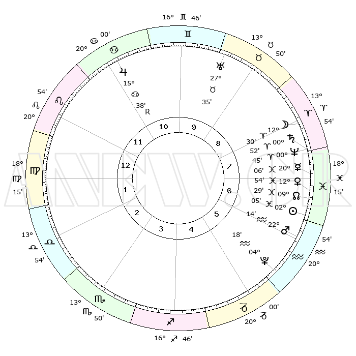 | | ΘΕΣΕΙΣ ΠΛΑΝΗΤΩΝ ΑΣΤΡΟΛΟΓΙΚΟΥ ΧΑΡΤΗ ΤΗΣ ΣΤΙΓΜΗΣ ΑΥΤΗΣ | | | | Πλανήτης | Ζώδιο | Μοίρες | Δεκαήμ. | Σε οίκο | Απόκλιση | | Ακμές των οίκων | | Ηλιος | Ιχθείς | 02°01' | Πρώτο | 7 | 10 S 45 | | 1ος | 28°57' | Λέων | | Σελήνη | Κριός | 11°35' | Δεύτερο | 8 | 07 N 13 | | 2ος | 22°42' | Παρθένος | | Ερμής | Ιχθείς | 20°02' | Τρίτο | 7 | 02 S 38 | | 3ος | 21°16' | Ζυγός | | Αφροδίτη | Ιχθείς | 12°49' | Δεύτερο | 7 | 08 S 05 | | 4ος | 24°11' | Σκορπιός | | Αρης | Υδροχόος | 22°11' | Τρίτο | 6 | 15 S 09 | | 5ος | 28°26' | Τοξότης | | Δίας | Καρκίνος | 15°38'R | Δεύτερο | 11 | 22 N 51 | | 6ος | 00°29' | Υδροχόος | | Κρόνος | Κριός | 00°52' | Πρώτο | 8 | 01 S 37 | | 7ος | 28°57' | Υδροχόος | | Ουρανός | Ταύρος | 27°35' | Τρίτο | 10 | 19 N 26 | | 8ος | 22°42' | Ιχθείς | | Ποσειδώνας | Κριός | 00°45' | Πρώτο | 8 | 00 S 54 | | 9ος | 21°16' | Κριός | | Πλούτωνας | Υδροχόος | 04°18' | Πρώτο | 6 | 22 S 55 | | 10ος | 24°10' | Ταύρος | | Β. Δεσμός | Ιχθείς | 09°29' | Πρώτο | 7 | 08 S 01 | | 11ος | 28°26' | Δίδυμοι | | Ωροσκόπος | Λέων | 28°57' | Τρίτο | | | 12ος | 00°29' | Λέων | | Μεσουράνημα | Ταύρος | 24°10' | Τρίτο | | | |